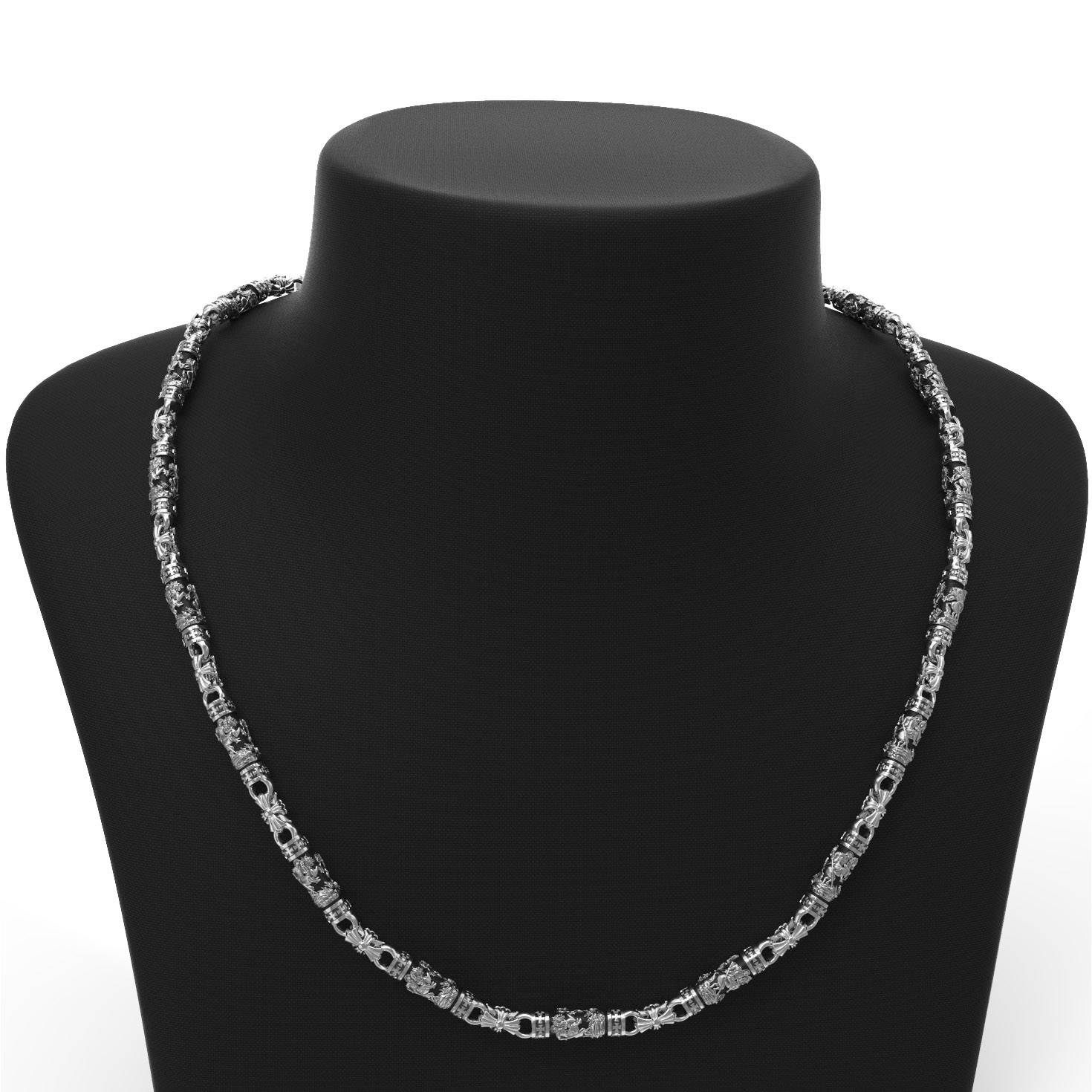 На звеньях цепи помещено изображение святого великомученика Георгия Победоносца — одного из самых почитаемых и удивительных святых. Георгий родился в Каппадокии (Малая Азия) в семье богатых и знатных горожан. Юношей поступил на службу к римскому императору Диоклетиану, за отличное знание военного дела и проявленную в боях и походах храбрость был приближен к императору и удостоен высокого воинского звания. Во время начавшихся гонений на христиан, перешел на сторону гонимых и, отвергнув человеческий страх, стал ярым проповедником учения Христа. Мучители подвергли опального воеводу жесточайшим восьмидневным пыткам и казнили его (обезглавили) в возрасте около тридцати лет в 303 году. На Руси он известен как Юрий или Егорий, заступник для верующих, чья жизнь имеет какое-либо отношение к военным делам, помощник в крестьянском труде. На цепи Георгий изображен как воитель, сидящий на вздыбленном коне и поражающий копьем огнедышащего змея. Змей символизирует собою сатанинские силы. Молитвами вознесенными к Всевышнему и своей непреклонной верой он смог одолеть чудовище. Святой убил змея, спас царскую дочь, принесенную в жертву, и жителей города, их души от влияния дьявола, породив в них надежду и веру в Господа, призывая людей принять христианскую веру.. На замке цепи изображена Хризма — монограмма имени Христа, которая состоит из двух начальных греческих букв имени — Х (хи) и Р (ро), скрещённых между собой. По краям монограммы помещены греческие буквы a и w. Такое употребление этих букв восходит к тексту Апокалипсиса: «Аз есмь Альфа и Омега, начало и конец, говорит Господь, Который есть и был и грядет, Вседержитель.» (Откр. 1:8; см. также Откр. 22:13).