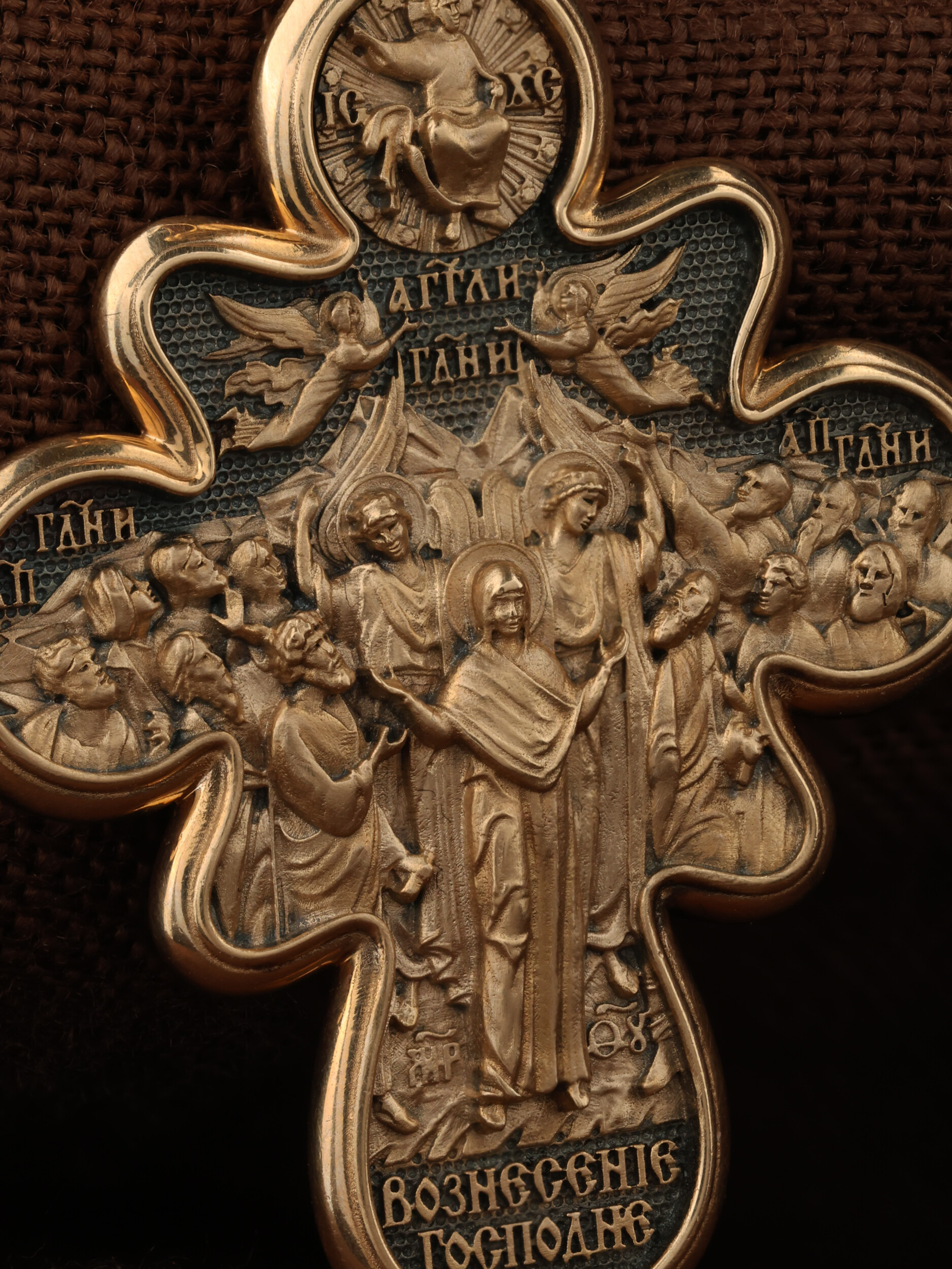 На оборотной стороне креста изображена икона Вознесение Господне. Описание события Вознесения Христова содержится в Евангелиях от Луки (Лк. 24, 50−51) и Марка (Мк. 16, 19), а также в Деяниях свв. апостолов (Деян 1, 9−11). Согласно этим повествованиям, после Своего Воскресения из мертвых Спаситель неоднократно являлся ученикам, чтобы удостоверить их в истинности Своего телесного Воскресения, укрепить в них веру и подготовить к принятию обетованного Святого Духа (Ин. 16, 7). На сороковой день после Своего Воскресения Господь Иисус Христос вывел учеников, собранных в Иерусалиме, из города в Вифанию, на гору Елеон (Деян. 1, 12). Здесь, после благословения апостолов, Он стал отдаляться от них и возноситься на небо. В Деяниях св. апостолов также упомянуто, что во время Вознесения Христова явились «два мужа в белой одежде», которые возвестили Его Второе пришествие: «Мужи галилейские! Что вы стоите и смотрите на небо? Сей Иисус, вознесшийся от вас на небо, придет таким же образом, как вы видели его восходящим на небо» (Деян. 1, 11). После Вознесения Господня ученики с радостью вернулись в Иерусалим (Лк. 24, 52), ожидая сошествия на них Святого Духа, которое произошло через несколько дней (Деян. 2, 1−4). На кулонном кольце изображен шестикрылый Ангел — Серафим.