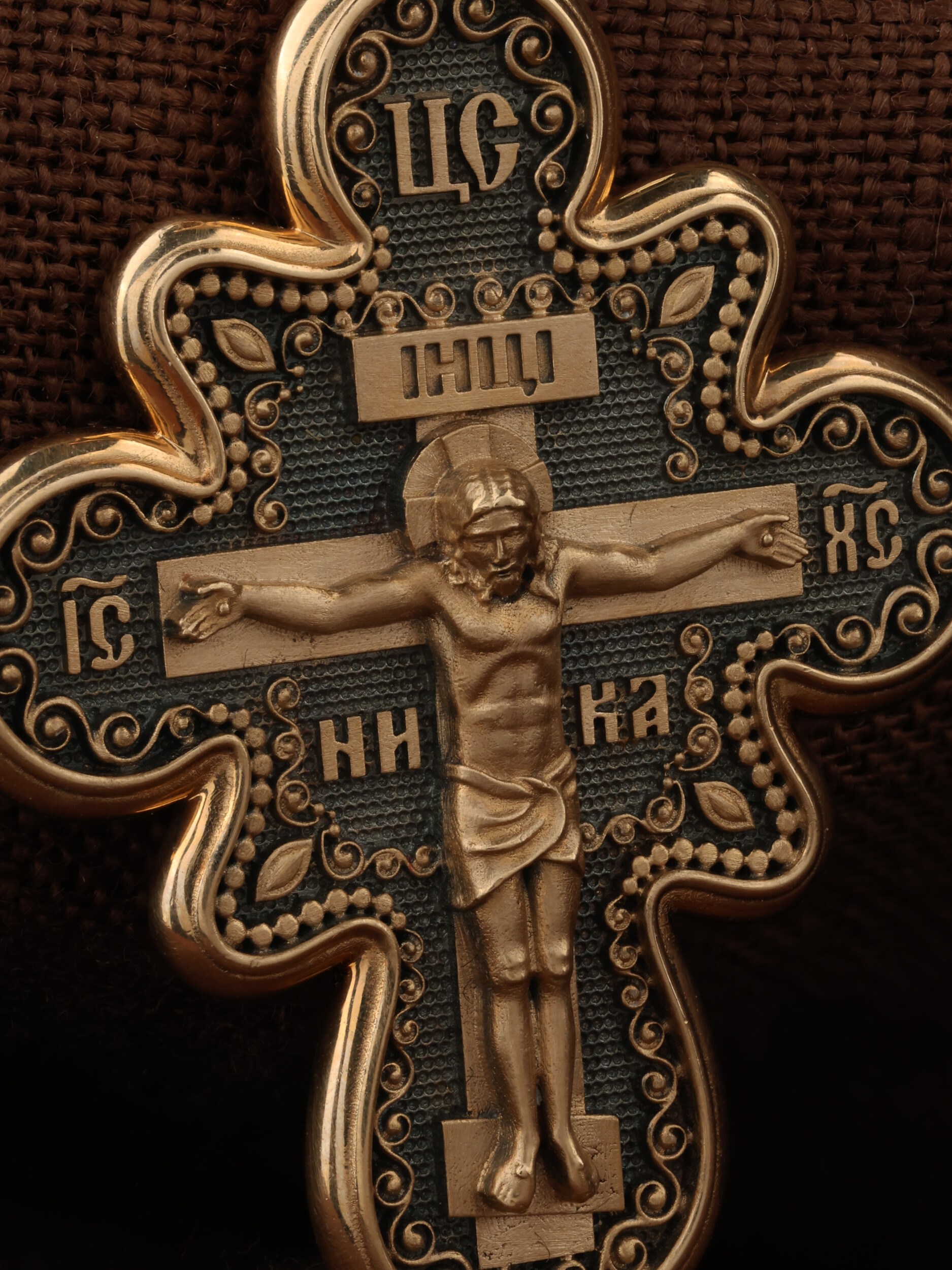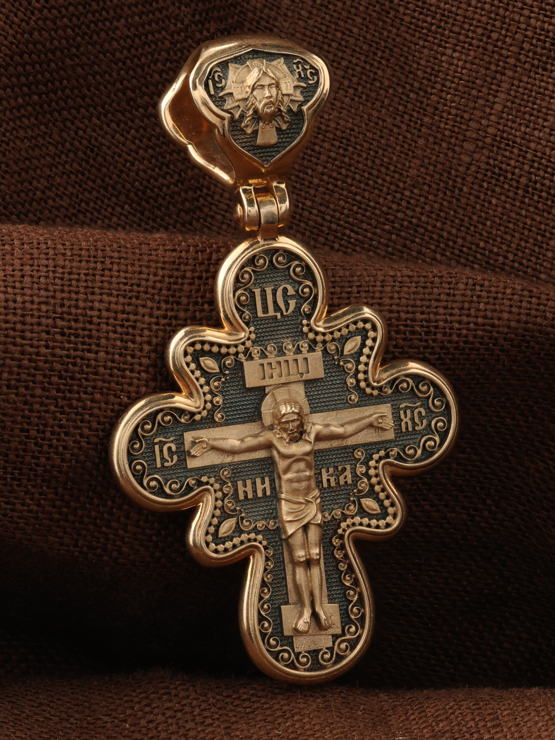 На лицевой стороне креста изображено Распятие Господа и Спасителя нашего Иисуса Христа. Крест- символ спасения и искупления рода человеческого, знамение победы над смертью и адом. Иисус Христос, как искупительная жертва освобождения человечества от власти греха, умер крестной смертью и в третий день воскрес. Над Распятием помещена надпись «Царь Славы». На верхней табличке, выше головы Иисуса, расположена надпись, составленная Понтием Пилатом — «IНЦI». Она означает «Иисус Назорей, Царь Иудейский». Надпись «IC» «ХC», означает Иисус Христос, помещается на разных сторонах поперечной перекладины креста. Рядом — слово «НИКА», что означает «победитель». На кулонном кольце изображен Нерукотворный образ Господа и Спасителя нашего Иисуса Христа, чудесно отпечатавшийся на плате, которым Христос вытер свой лик.