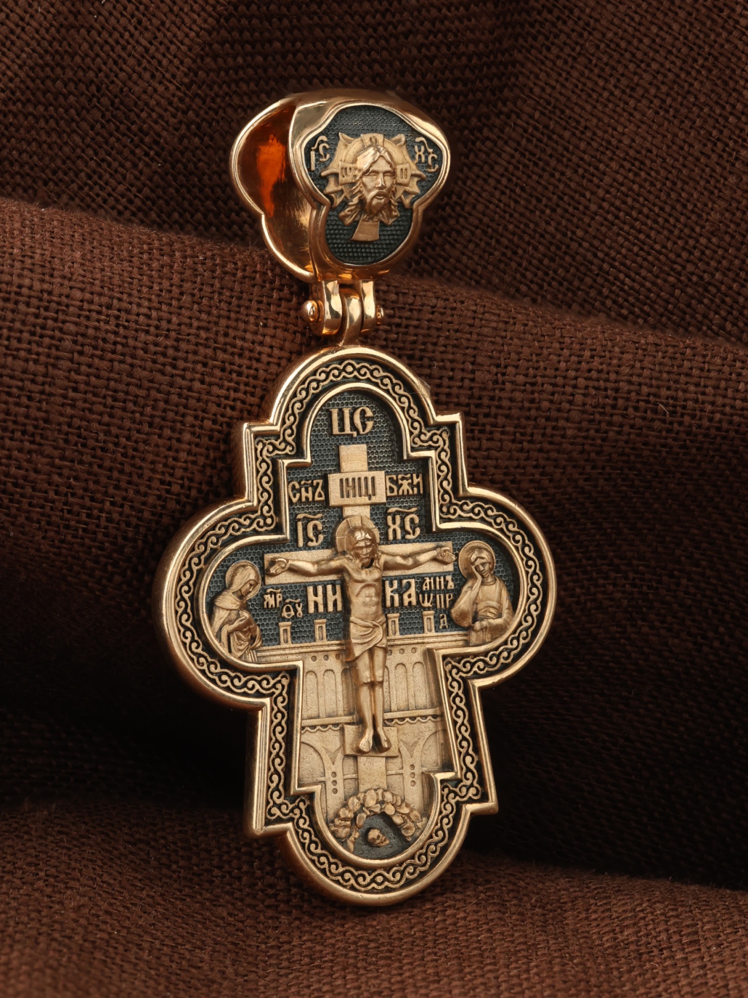 На лицевой стороне креста изображено Распятие Господа и Спасителя нашего Иисуса Христа, отдавшего Себя на смерть, для искупления грехов мира. Крест является символом жертвенной любви всеблагого Бога к падшим людям, всепобеждающим духовным оружием христиан, основанием и средоточием церковной жизни. Над Распятием помещена надпись «Царь Славы». Верхняя перекладина символизирует титло — табличку, на которой, согласно Евангелию, было начертано: Иисус Назорей Царь Иудейский (IНЦI). Распятие сопровождается надписями, олицетворяющими Христа. Надпись «Сын Божий» означает божественную природу Иисуса Христа. Надпись «IС» « ХС» означает Иисус Христос и размещена над поперечной перекладиной. Ниже — слово «НИКА», что означает «победитель». Слева от Распятия изображена Пресвятая Богородица, справа — апостол и евангелист Иоанн Богослов, один из ближайших учеников Иисуса Христа. За крестом высится Иерусалимская стена, в знак того, что Господь был распят вне стен города. Возвышение, на котором стоит Крест, символизирует гору Голгофу, на которой произошло Распятие. Под подножием Креста изображена покоящаяся голова (череп) Адама. На кулонном кольце изображен Нерукотворный образ Господа и Спасителя нашего Иисуса Христа, чудесно отпечатавшийся на плате, которым Христос вытер свой лик.