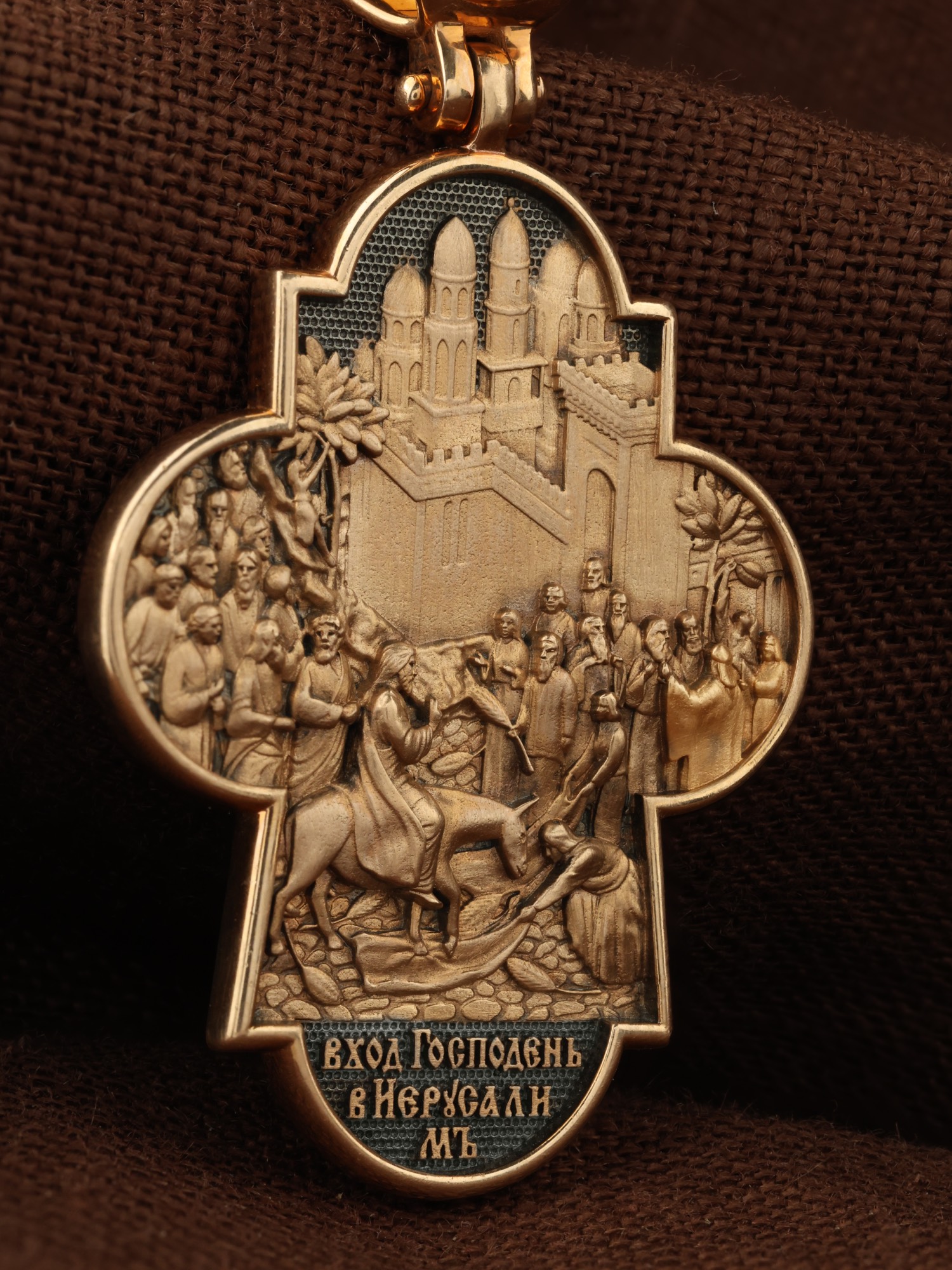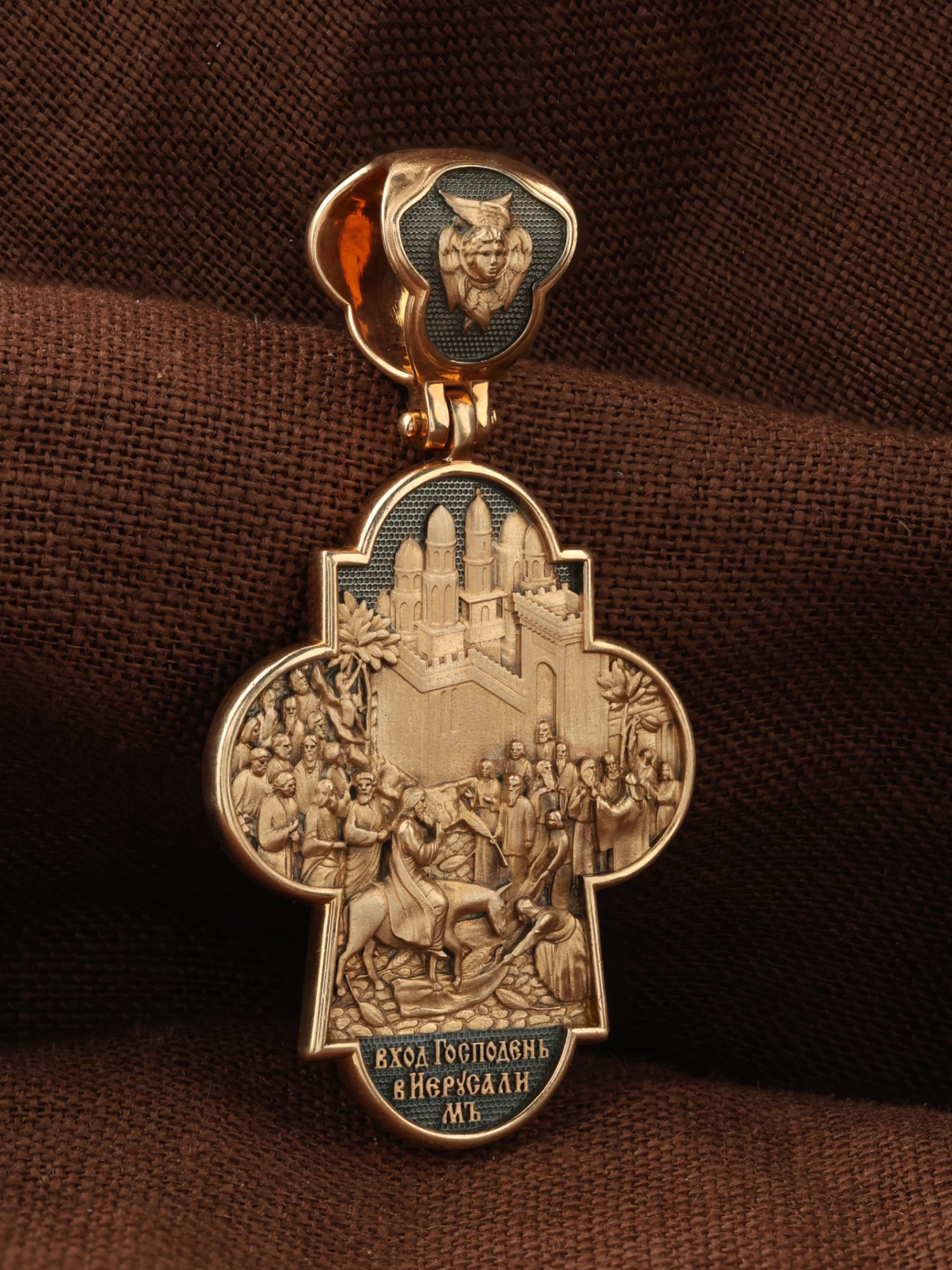 На оборотной стороне креста изображена икона Вход Господень во Иерусалим. Вход Господень в Иерусалим является одним из главных событий последних дней земной жизни Господа Иисуса Христа; оно описано четырьмя евангелистами. Господь в сопровождении учеников выехал из села Вифании и направился в Святой Град. С Елеонской горы Господь устремил свой взор на Иерусалим, вглядываясь в раскинувшийся внизу город, которому предназначено было стать Чашей Его Страданий. Толпы народа встречали Его, держа в руках пальмовые ветви (вайи), приветствуя криками: «Осанна!», что значит «спасение, радость, слава». Вход Господень в Иерусалим символически означает Второе Пришествие Христа. В Своем Первом Пришествии на землю Он явил Себя человечеству как Искупитель и Спаситель; во Втором — придет как Царь мира и Судия. На кулонном кольце изображен шестикрылый Ангел — Серафим.