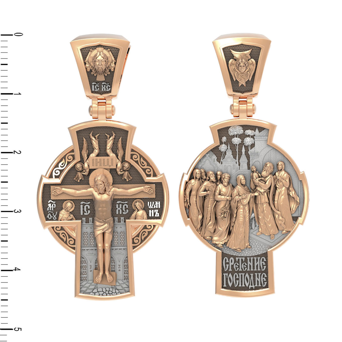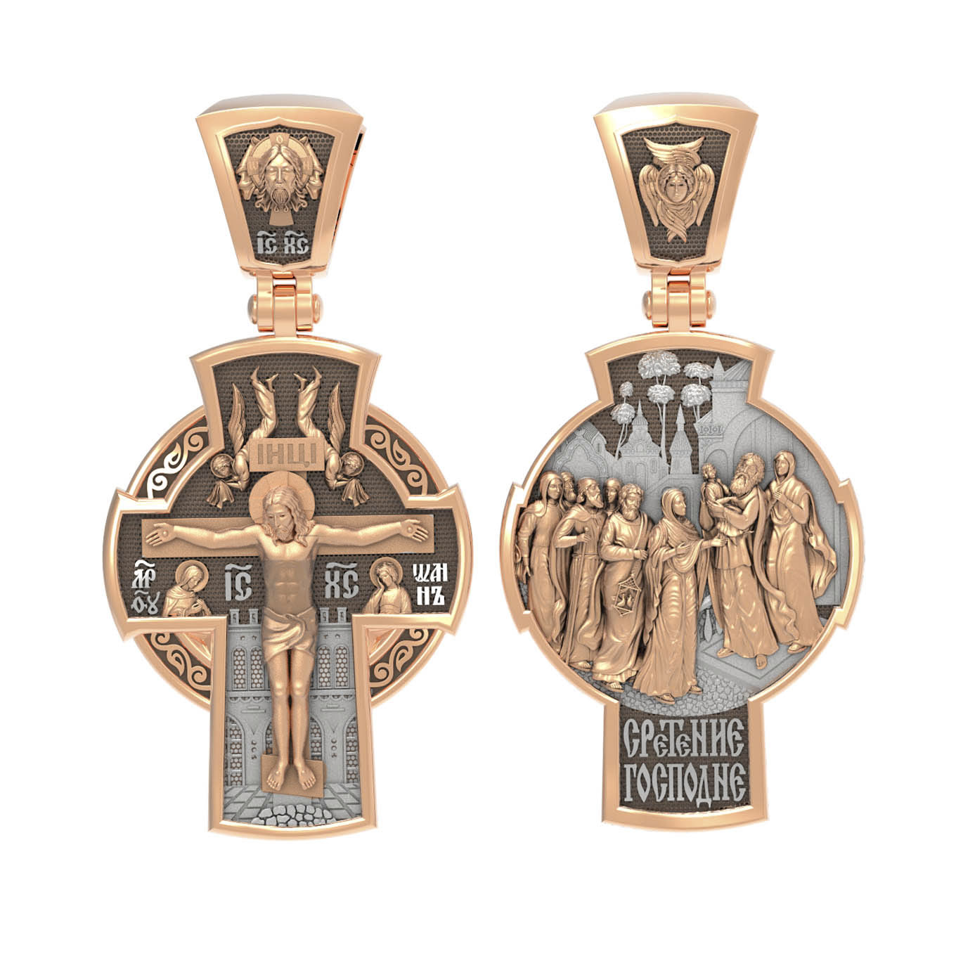 На оборотной стороне креста изображена икона Сретение Господне. В сороковой день по рождении Богомладенец был принесен в Иерусалимский храм. В это время жил в Иерусалиме праведный старец Симеон. Ему было откровение, что он не умрет, пока не увидит Христа Спасителя. По внушению свыше благочестивый старец пришел в храм в то время, когда Пресвятая Богородица и праведный Иосиф принесли туда Младенца Иисуса, чтобы исполнить законный обряд. Богоприимец Симеон взял Богомладенца на руки и, благословив Бога, изрек пророчество о Спасителе мира: «Ныне отпускаешь раба Твоего, Владыка, по слову Твоему, с миром, ибо видели очи мои спасение Твое, которое Ты уготовал пред лицем всех народов, свет к просвещению язычников и славу народа Твоего Израиля» (Лк. 2: 29–32). Пресвятой Деве праведный Симеон сказал: «Се, лежит Сей на падение и на восстание многих в Израиле и в предмет пререканий, и Тебе Самой оружие пройдет душу, да откроются помышления многих сердец». В храме была также 84-летняя вдовица Анна, пророчица, дочь Фануилова, которая постом и молитвой служила Богу в храме день и ночь. Она «славила Господа и говорила о Богомладенце всем, ожидавшим избавления в Иерусалиме». На кулонном кольце изображен шестикрылый Ангел — Серафим.