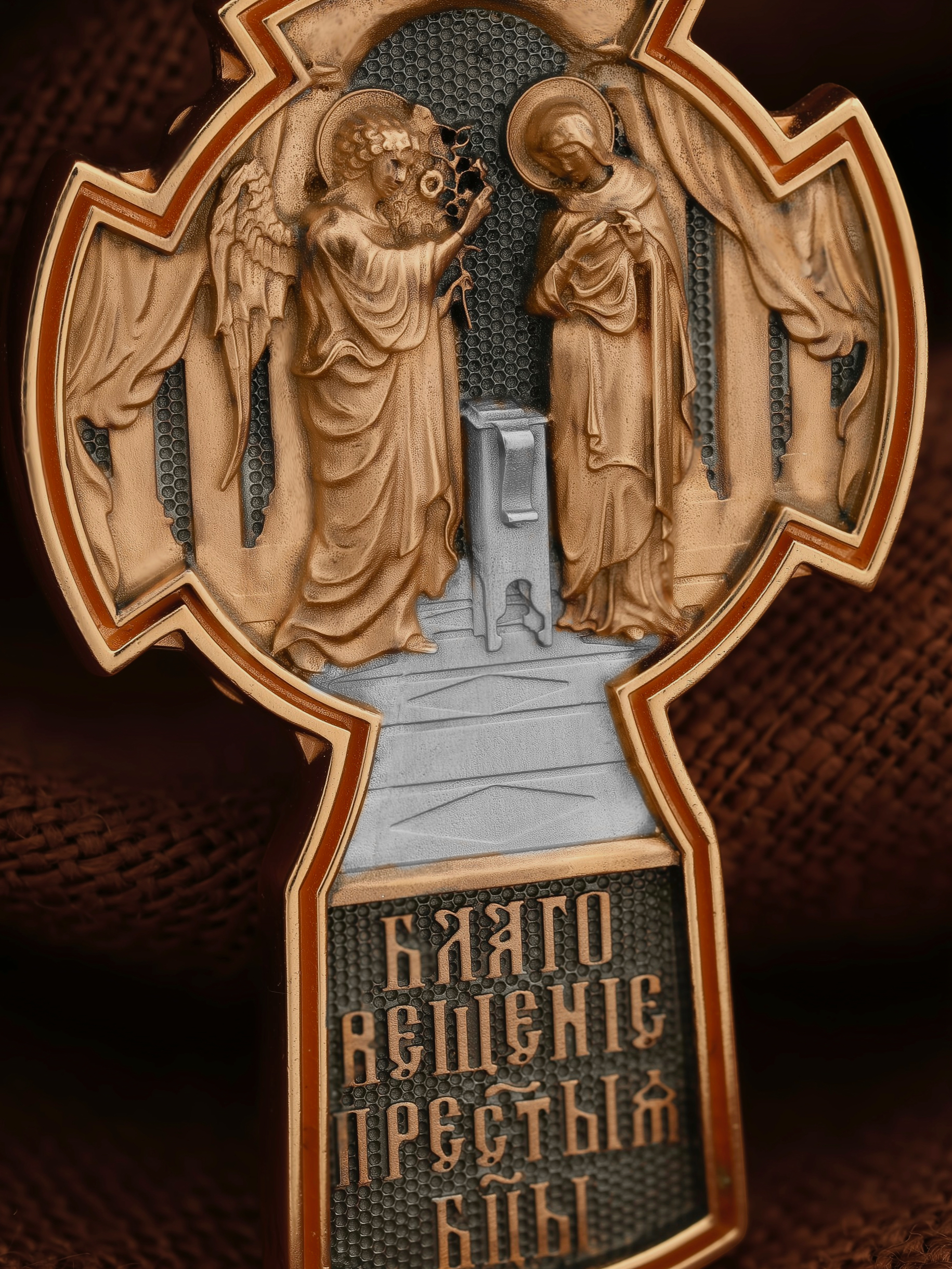 На оборотной стороне креста изображена икона «Благовещение Пресвятой Богородицы». Как нам повествует Священное Писание, Архангел Гавриил послан был от Бога в город Назарет к Пресвятой Деве Марии с радостной вестью, что Господь избрал Ее быть Матерью Спасителя мира. Ангел сказал: «Радуйся благодатная! Господь с Тобою! Благословенна Ты между женами». Мария cмутилась от слов Ангела и думала: что значит это приветствие? Ангел же продолжал говорить Ей: «не бойся, Мария, ибо Ты обрела благодать у Бога. И вот, Ты родишь Сына и наречешь имя Ему Иисус. Он будет велик, и назовется сыном Всевышнего, и Царству Его не будет конца…» На кулонном кольце изображен Ангел Серафим.