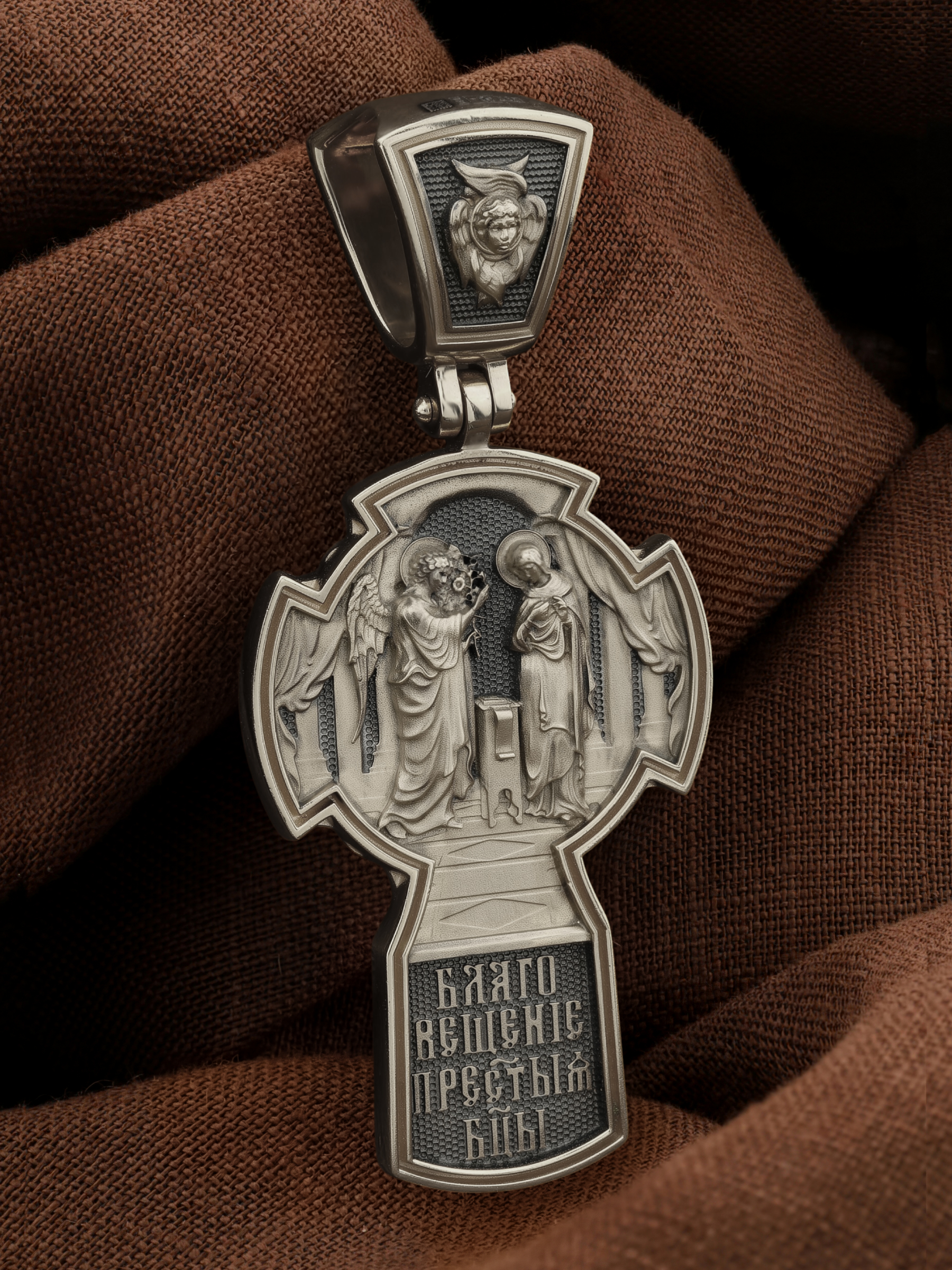На оборотной стороне креста изображена икона «Благовещение Пресвятой Богородицы». Как нам повествует Священное Писание, Архангел Гавриил послан был от Бога в город Назарет к Пресвятой Деве Марии с радостной вестью, что Господь избрал Ее быть Матерью Спасителя мира. Ангел сказал: «Радуйся благодатная! Господь с Тобою! Благословенна Ты между женами». Мария cмутилась от слов Ангела и думала: что значит это приветствие? Ангел же продолжал говорить Ей: «не бойся, Мария, ибо Ты обрела благодать у Бога. И вот, Ты родишь Сына и наречешь имя Ему Иисус. Он будет велик, и назовется сыном Всевышнего, и Царству Его не будет конца…» На кулонном кольце изображен Ангел Серафим.