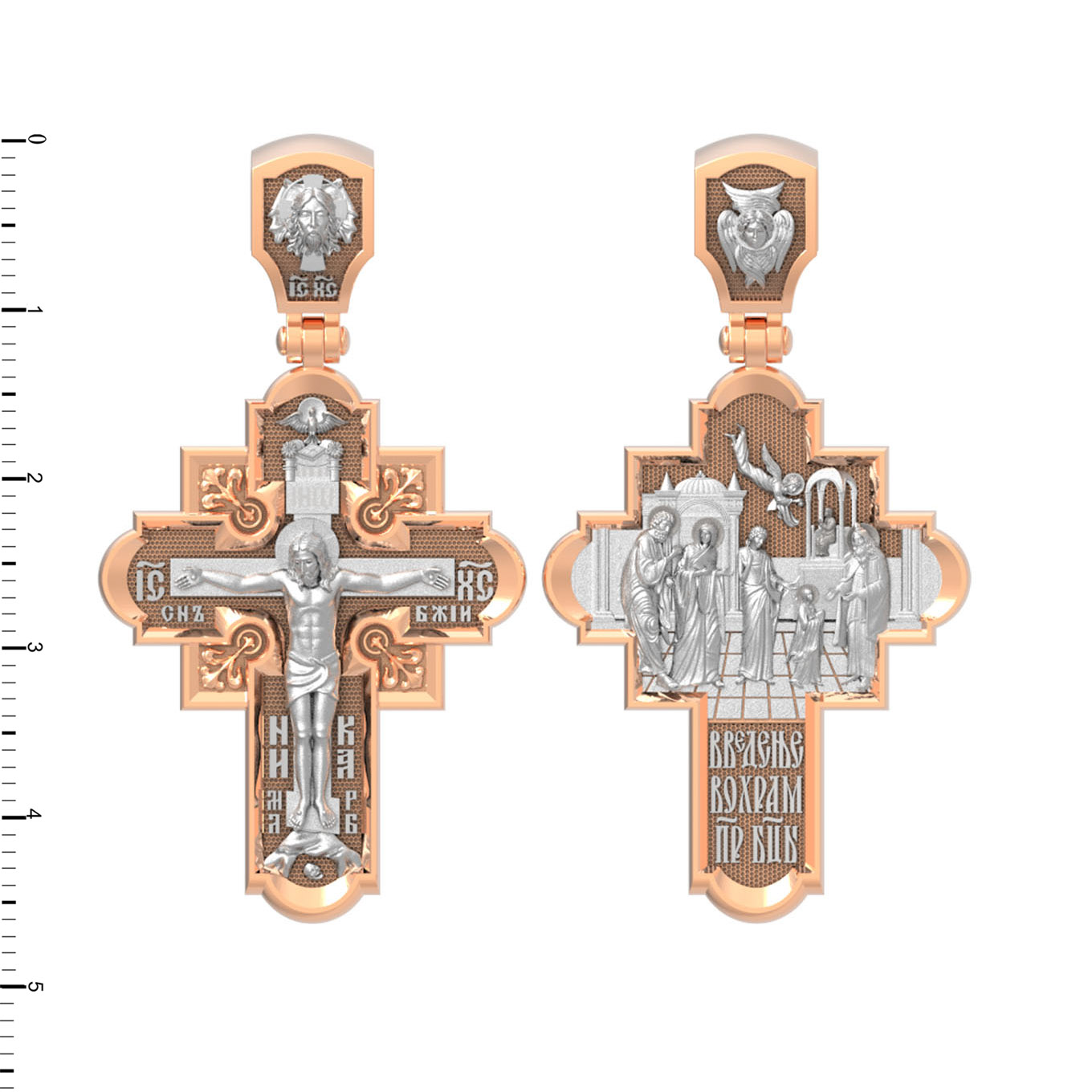 На оборотной стороне креста изображена икона Введение во Храм Пресвятой Богородицы. По сохраненным Преданием рассказам, родители Девы Марии, праведные Иоаким и Анна, молясь о разрешении неплодства, дали обет, если родится дитя, посвятить его на служение Богу. Когда Пресвятой Деве исполнилось три года, святые родители решили выполнить свое обещание. Собрав родственников и знакомых, одев Пречистую Марию в лучшие одежды, с пением священных песней, с зажженными свечами в руках привели ее в Иерусалимский храм. Там встретил отроковицу первосвященник со множеством священников. В храм вела лестница в пятнадцать высоких ступеней. Младенец Мария, казалось, не могла бы Сама взойти по этой лестнице. Но как только Ее поставили на первую ступень, укрепляемая силой Божией, Она быстро преодолела остальные ступени и взошла на верхнюю. Затем первосвященник, по внушению свыше, ввел Пресвятую Деву в Святое святых, куда из всех людей только раз в году входил первосвященник с очистительной жертвенной кровью. Все присутствовавшие в храме дивились необыкновенному событию. На кулонном кольце изображен шестикрылый Ангел — Серафим.