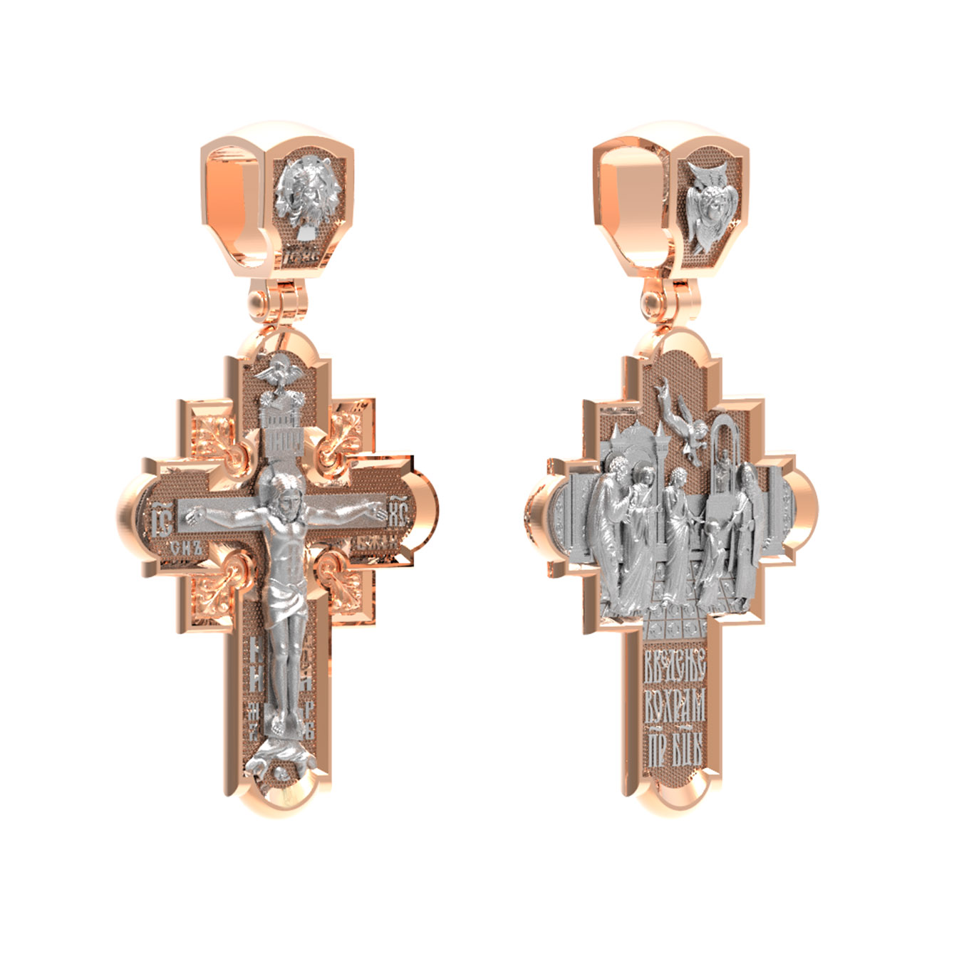 На лицевой стороне креста изображено Распятие Господа и Спасителя нашего Иисуса Христа. Крест- символ спасения и искупления рода человеческого, знамение победы над смертью и адом. Иисус Христос, как искупительная жертва освобождения человечества от власти греха, умер крестной смертью и в третий день воскрес. Верхняя перекладина символизирует титло — табличку, на которой, согласно Евангелию, было начертано: Иисус Назорей Царь Иудейский (IНЦI). Надпись «IC» «ХC», означает Иисус Христос, помещается на разных сторонах поперечной перекладины креста. Ниже перекладины расположено словосочетание «СЫН БОЖИЙ», что означает божественную природу Иисуса Христа. Надпись «МЛРБ» — «место лобное рай бысть» означает, что место лобное стало раем и помещаются в нижней части креста. Рядом — слово «НИКА», что означает «победитель». Возвышение, на котором стоит Крест, символизирует гору Голгофу, на которой произошло Распятие. Под подножием Креста изображена покоящаяся голова (череп) Адама. На кулонном кольце изображен Нерукотворный образ Господа и Спасителя нашего Иисуса Христа, чудесно отпечатавшийся на плате, которым Христос вытер свой лик. Ниже надпись — «IC» «ХC».
