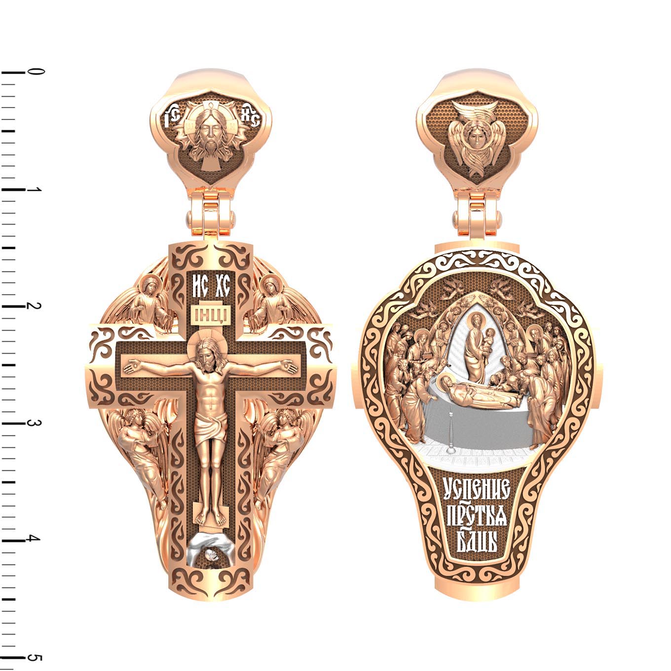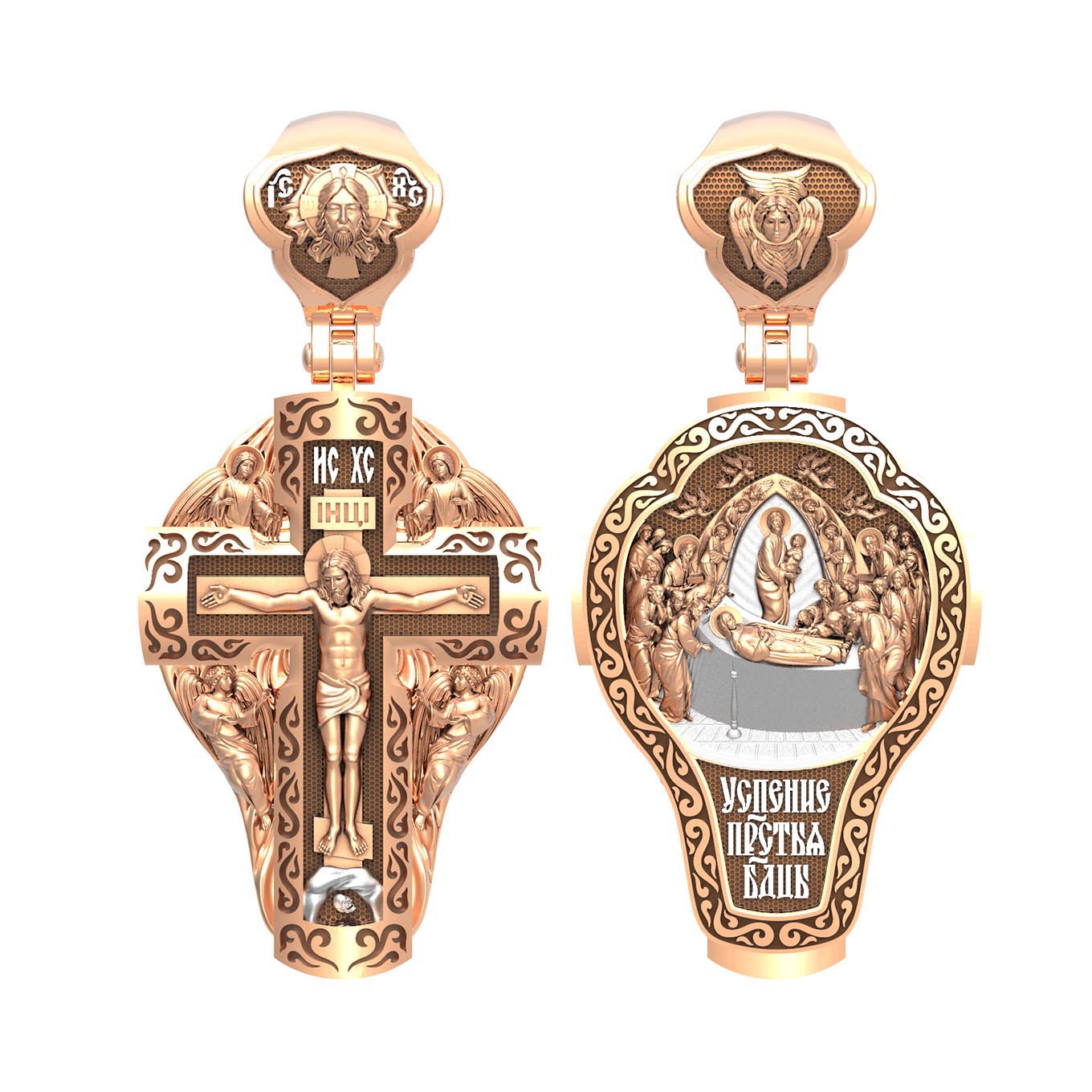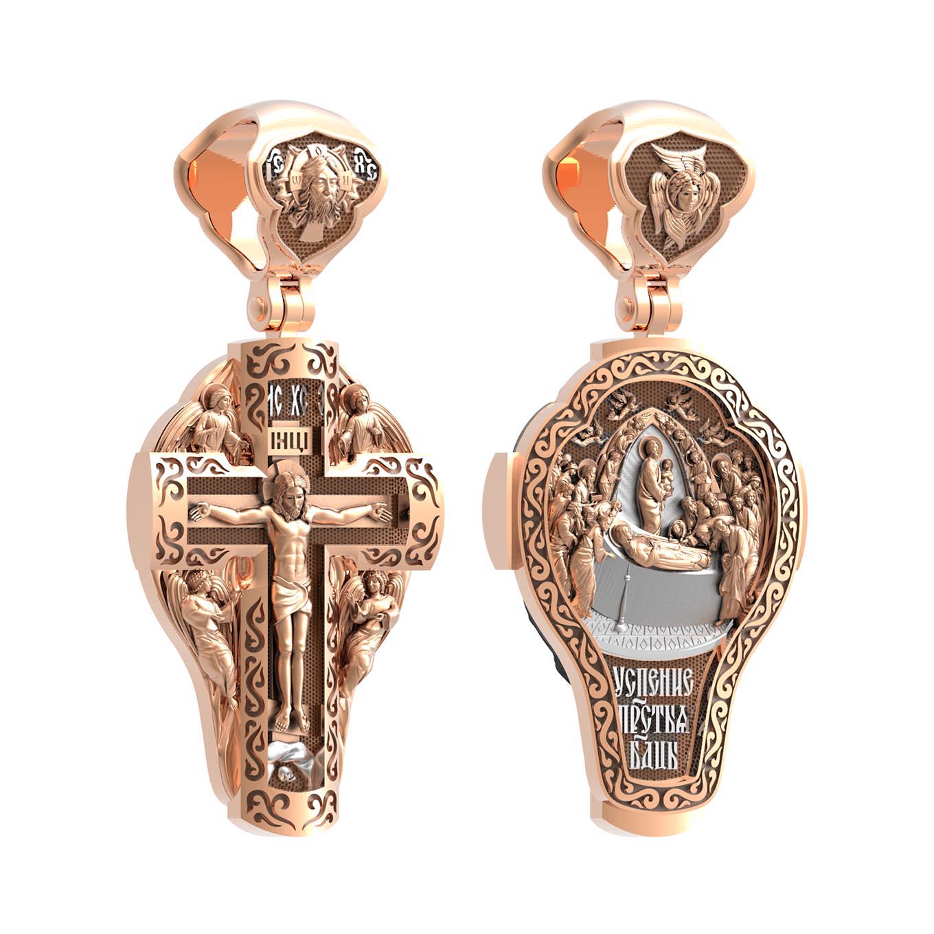 На оборотной стороне креста изображена икона Успения Пресвятой Богородицы. Все годы после Распятия, Воскресения и Вознесения Иисуса Христа Пресвятая Дева провела большей частью в Иерусалиме, проповедуя Господа наравне с апостолами. Но вот настало время Ее земной кончины. Архангел Гавриил возвестил Ей, что через три дня душа Ее оставит тело. Но Богородица очень обрадовалась. Ведь Ее ожидала встреча с Тем, Кого Она любила гораздо больше, чем жизнь. Три дня спустя в доме апостола Иоанна, где жила Мария, собрались и другие апостолы: Господь чудесным образом устроил так, что все они вернулись к этому дню из дальних странствий, где проповедовали Христа. Не было только Фомы. Апостолы стали свидетелями блаженной кончины Святой Девы. Сам Христос, окруженный множеством ангелов, явился, чтобы принять душу Своей Пречистой Матери и возвести Ее в рай. На кулонном кольце изображен шестикрылый Ангел — Серафим.