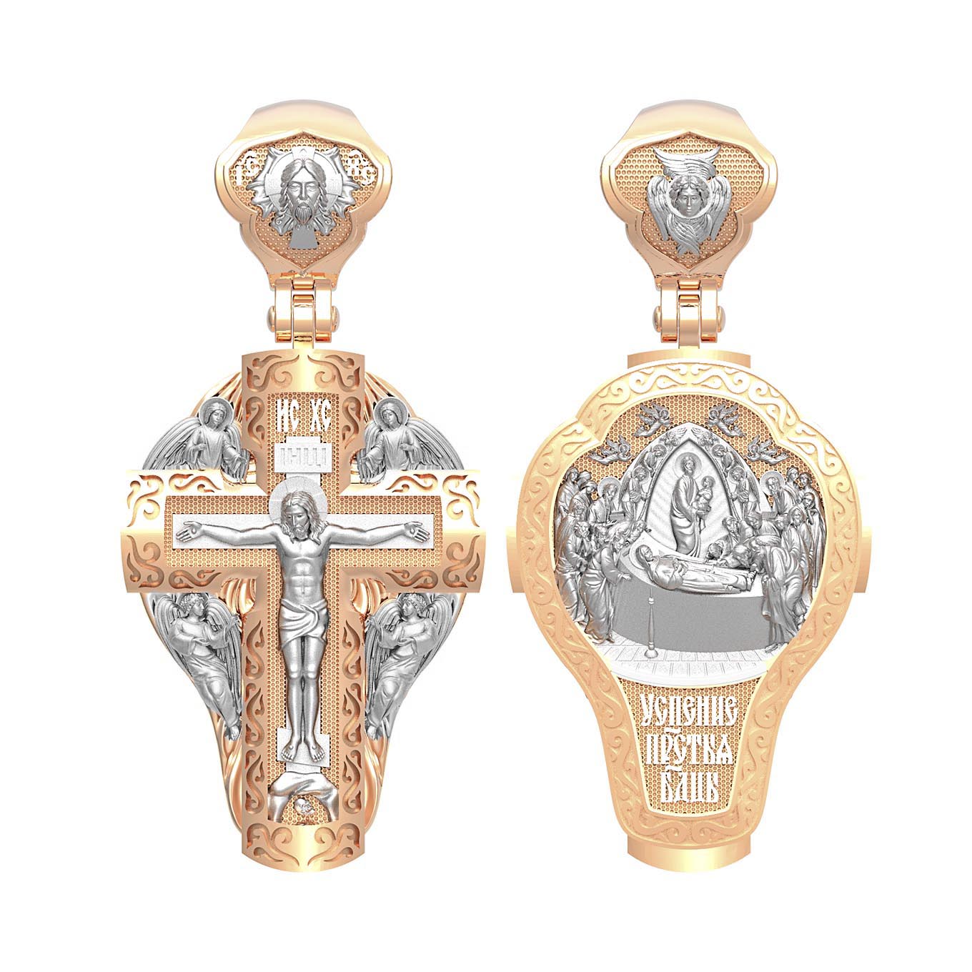 На оборотной стороне креста изображена икона Успения Пресвятой Богородицы. Все годы после Распятия, Воскресения и Вознесения Иисуса Христа Пресвятая Дева провела большей частью в Иерусалиме, проповедуя Господа наравне с апостолами. Но вот настало время Ее земной кончины. Архангел Гавриил возвестил Ей, что через три дня душа Ее оставит тело. Но Богородица очень обрадовалась. Ведь Ее ожидала встреча с Тем, Кого Она любила гораздо больше, чем жизнь. Три дня спустя в доме апостола Иоанна, где жила Мария, собрались и другие апостолы: Господь чудесным образом устроил так, что все они вернулись к этому дню из дальних странствий, где проповедовали Христа. Не было только Фомы. Апостолы стали свидетелями блаженной кончины Святой Девы. Сам Христос, окруженный множеством ангелов, явился, чтобы принять душу Своей Пречистой Матери и возвести Ее в рай. На кулонном кольце изображен шестикрылый Ангел — Серафим.