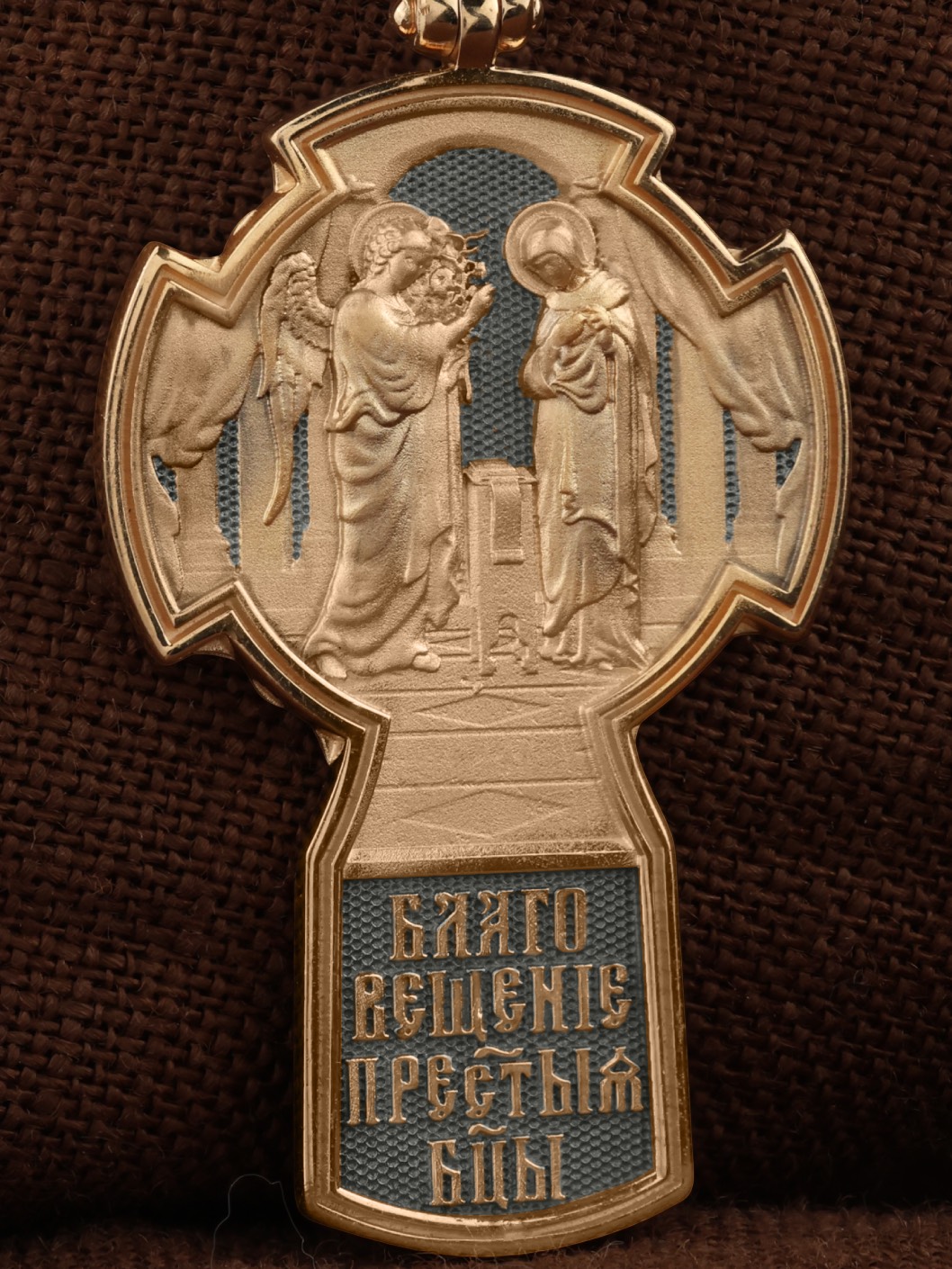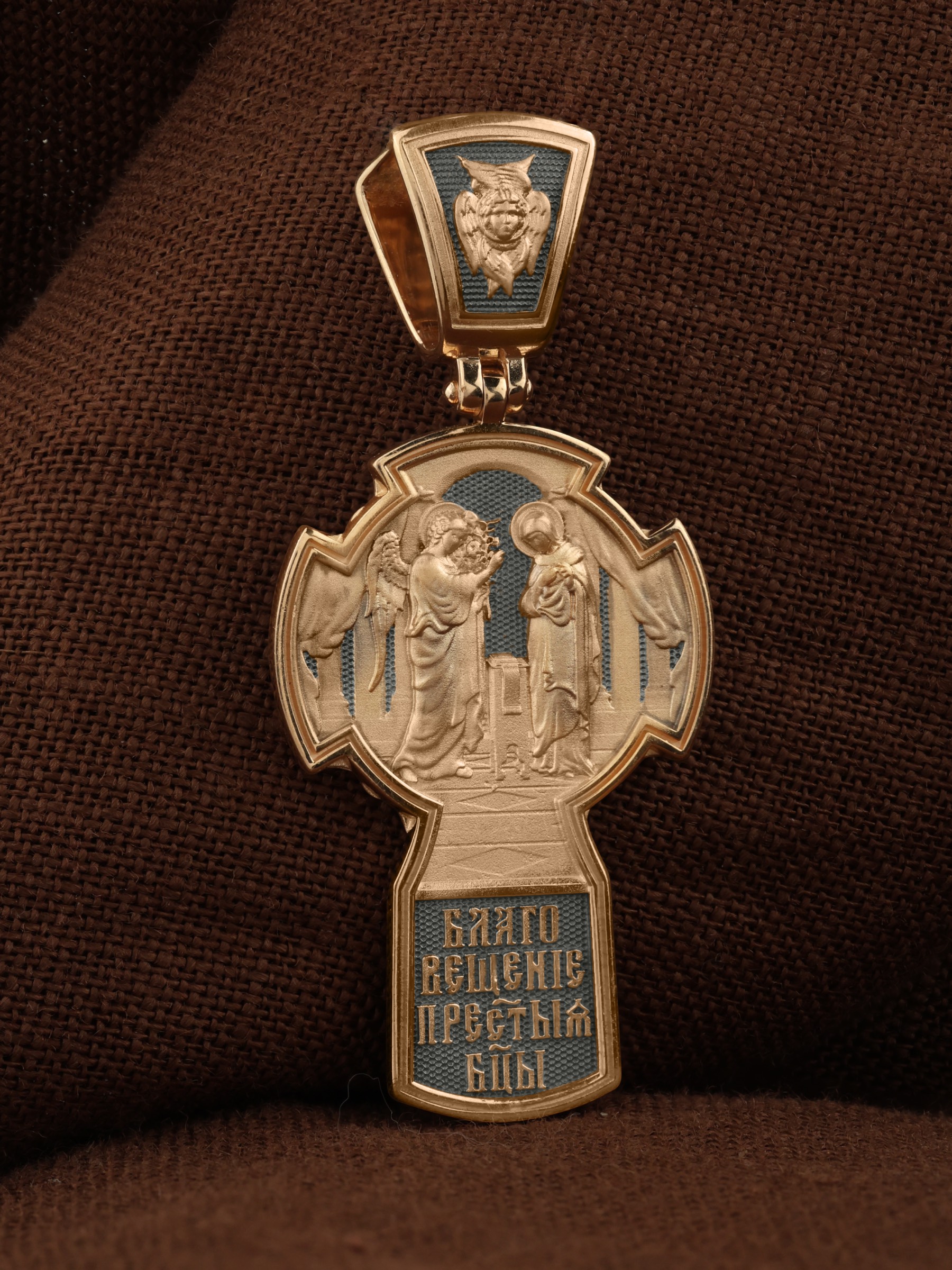 На оборотной стороне креста изображена икона «Благовещение Пресвятой Богородицы». Как нам повествует Священное Писание, Архангел Гавриил послан был от Бога в город Назарет к Пресвятой Деве Марии с радостной вестью, что Господь избрал Ее быть Матерью Спасителя мира. Ангел сказал: «Радуйся благодатная! Господь с Тобою! Благословенна Ты между женами». Мария cмутилась от слов Ангела и думала: что значит это приветствие? Ангел же продолжал говорить Ей: «не бойся, Мария, ибо Ты обрела благодать у Бога. И вот, Ты родишь Сына и наречешь имя Ему Иисус. Он будет велик, и назовется сыном Всевышнего, и Царству Его не будет конца…» На кулонном кольце изображен Ангел Серафим.