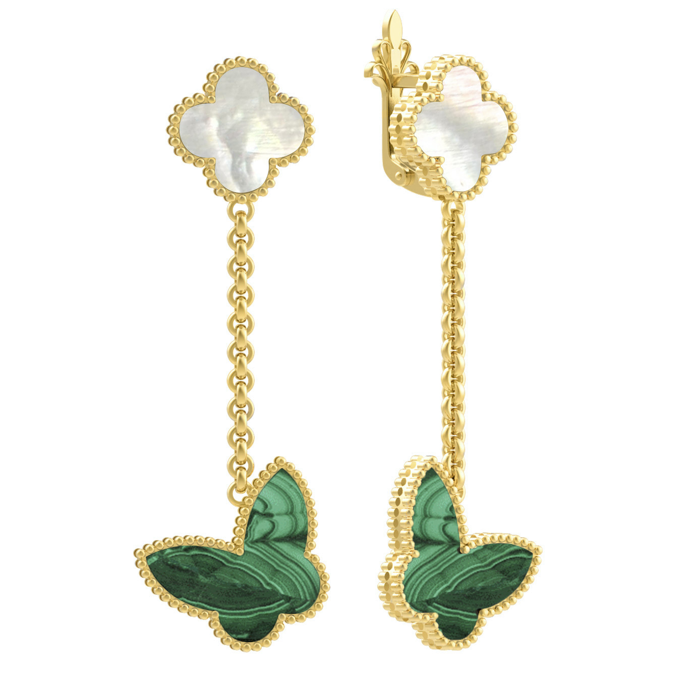 В центре композиции — сочетание контрастных вставок: завораживающего зеленого малахита и нежного перламутра. Две вставки, искусно ограненные, создают выразительный дуэт, который привлекает внимание к лицу и подчеркивает индивидуальность владелицы. Уникальный дизайн, где перламутр дополняет верхнюю часть, а малахит образует форму крыльев бабочки на подвижной цепочке, делает эти серьги настоящим произведением ювелирного искусства.