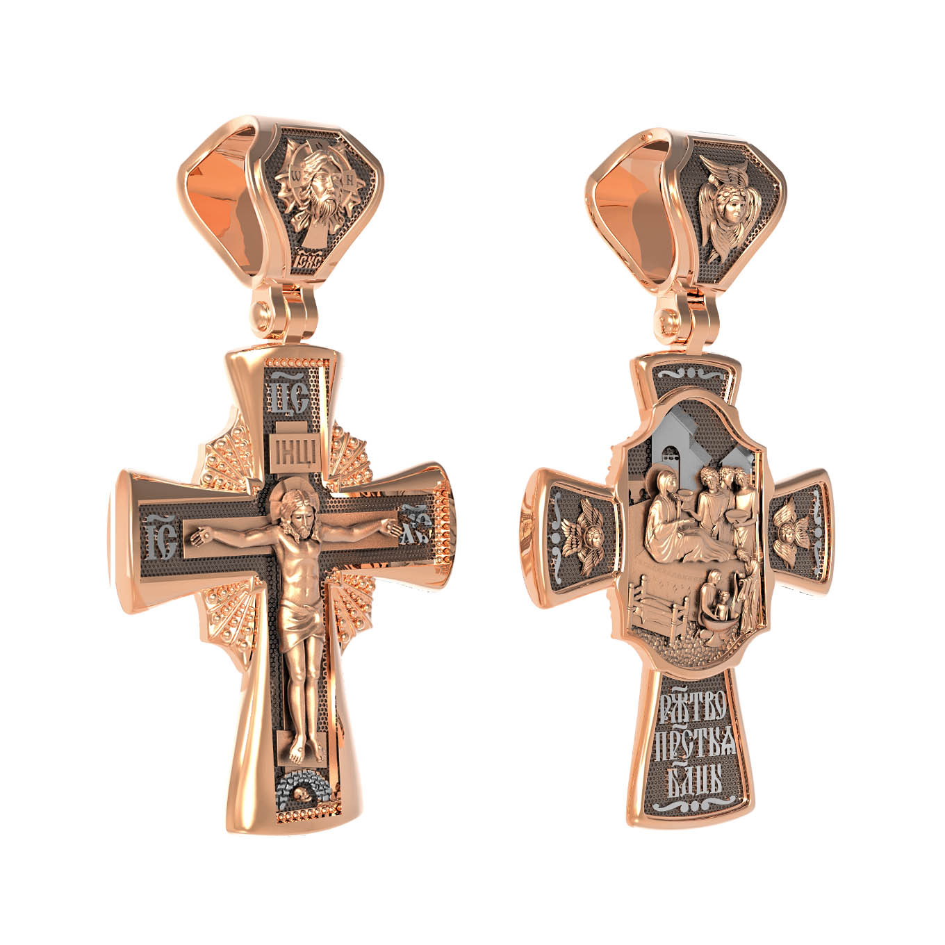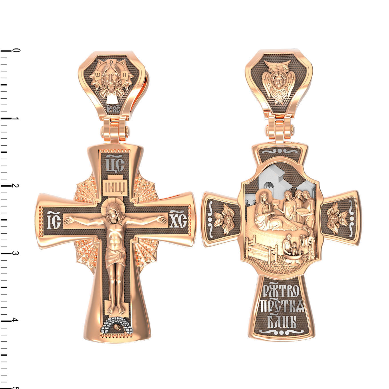 На оборотной стороне креста изображена икона Рождество Пресвятой Богородицы. Согласно церковному Преданию, Пресвятая Дева Мария родилась в небольшом галилейском городе Назарете. Родителями Её были праведные Иоаким и Анна. Супруги были бездетны, но не теряли надежды, что Господь может разрешить неплодство Анны даже в её преклонном возрасте. Они горячо молились и просили Господа даровать им дитя, которое обещали посвятить Богу для служения в храме. И Господь услышал их молитвы: Праведная Анна зачала и разрешилась дочерью Марией — будущей Пресвятой Богородицей. На кулонном кольце изображен шестикрылый Ангел — Серафим.