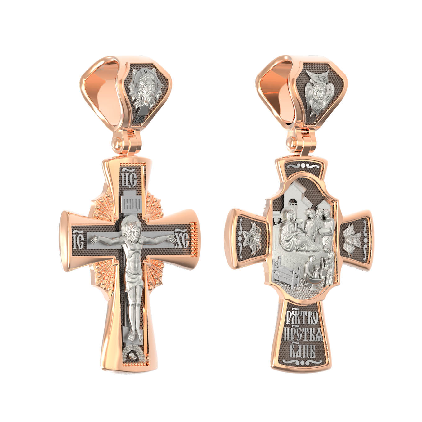 На лицевой стороне креста изображено Распятие Господа и Спасителя нашего Иисуса Христа, отдавшего Себя на смерть, для искупления грехов мира. Крест является символом жертвенной любви Всеблагого Бога к падшим людям, всепобеждающим духовным оружием христиан, основанием и средоточием церковной жизни. Господь сказал: кто хочет идти за Мною, отвергнись себя, и возьми крест свой, и следуй за Мною. (Мк. 8: 34). Над Распятием помещена надпись «Царь Славы». На верхней табличке, выше головы Иисуса, расположена надпись, составленная Понтием Пилатом — «IНЦI». Она означает «Иисус Назорей, Царь Иудейский». Надпись «IC» «ХC», означает Иисус Христос, помещается на разных сторонах поперечной перекладины креста. Возвышение, на котором стоит Крест, символизирует гору Голгофу, на которой произошло Распятие. Под подножием Креста изображена покоящаяся голова (череп) Адама. На кулонном кольце изображен Нерукотворный образ Господа и Спасителя нашего Иисуса Христа, чудесно отпечатавшийся на плате, которым Христос вытер свой лик. Ниже надпись — «IC» «ХC».