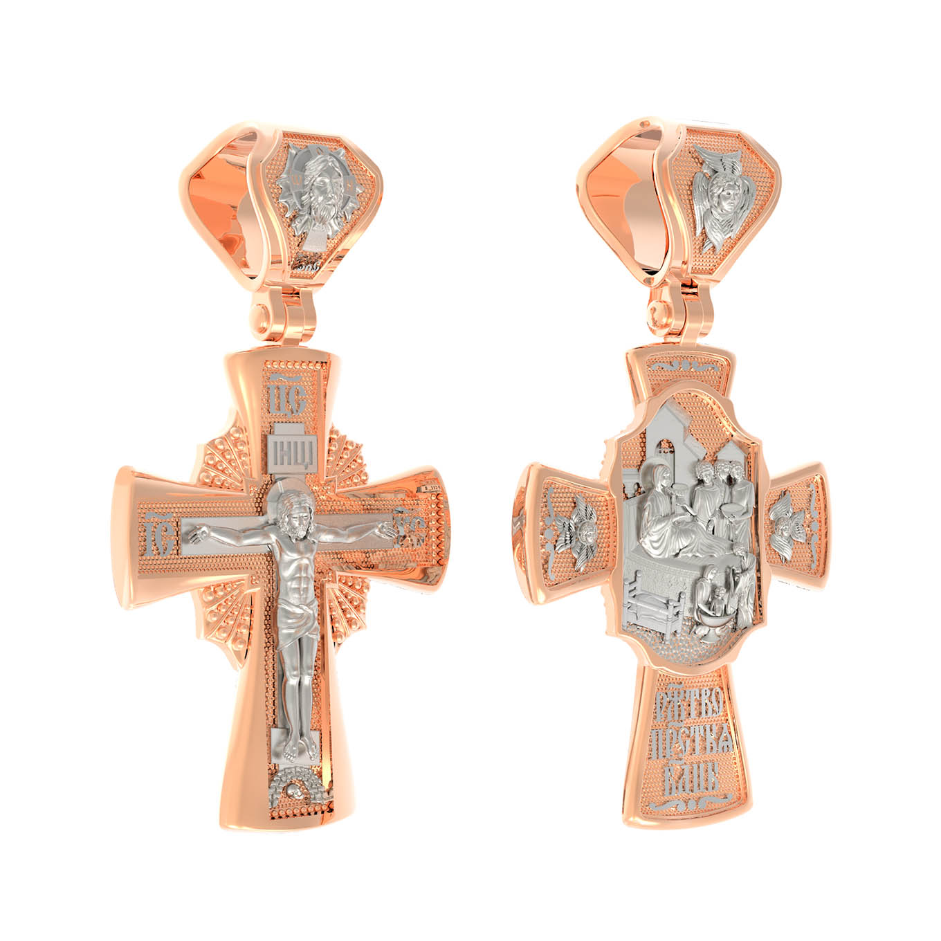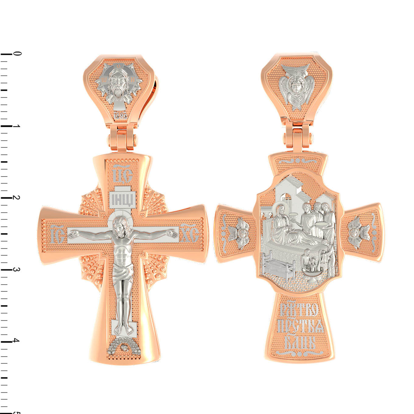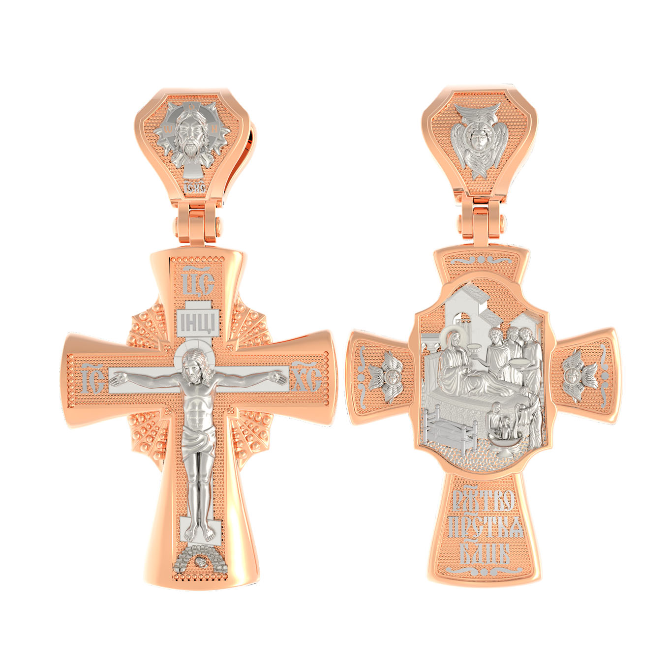 На оборотной стороне креста изображена икона Рождество Пресвятой Богородицы. Согласно церковному Преданию, Пресвятая Дева Мария родилась в небольшом галилейском городе Назарете. Родителями Её были праведные Иоаким и Анна. Супруги были бездетны, но не теряли надежды, что Господь может разрешить неплодство Анны даже в её преклонном возрасте. Они горячо молились и просили Господа даровать им дитя, которое обещали посвятить Богу для служения в храме. И Господь услышал их молитвы: Праведная Анна зачала и разрешилась дочерью Марией — будущей Пресвятой Богородицей. На кулонном кольце изображен шестикрылый Ангел — Серафим.