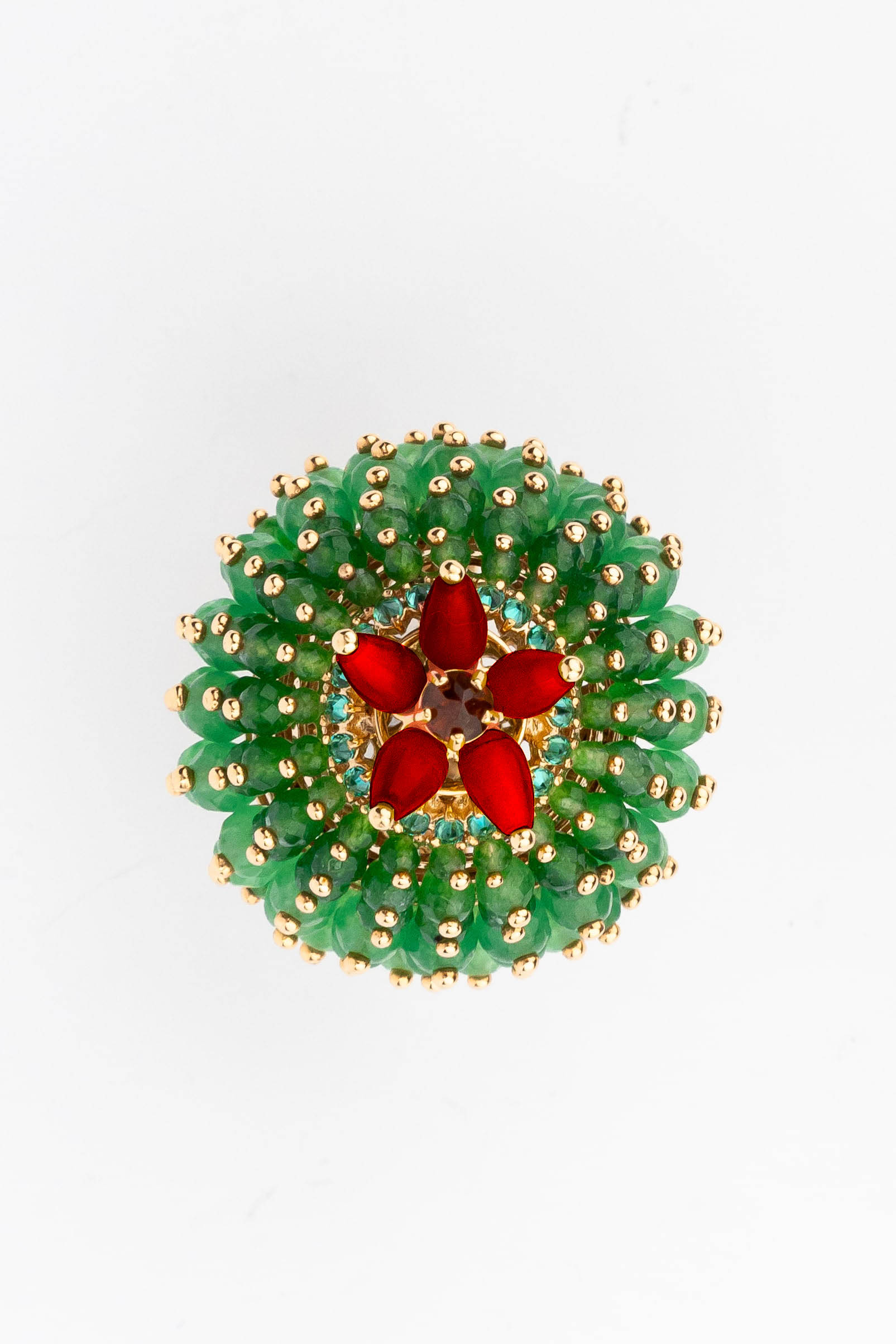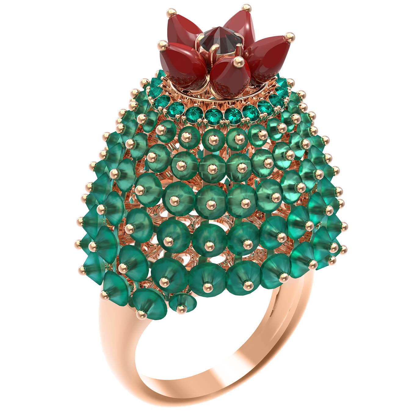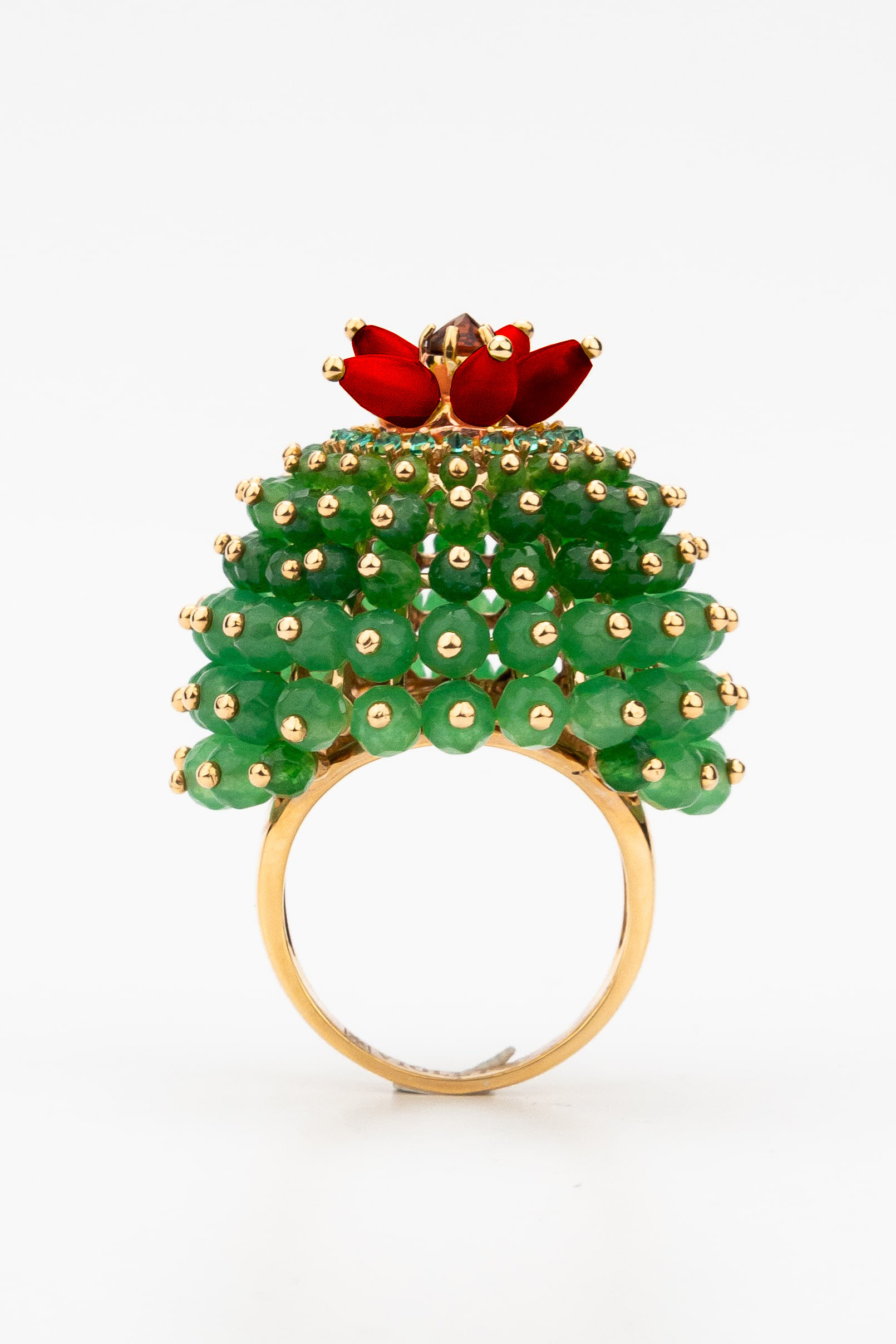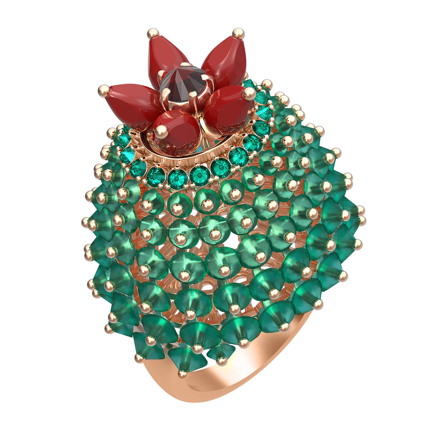 Великолепное кольцо украшают 138 вставок, среди которых гармонично сочетаются гранат, изумруд, коралл и хризопраз. Разнообразие форм вставок — круглые элементы и бусины — создают неповторимую фактуру, напоминающую природные очертания экзотического растения. Контраст бирюзовых, зеленых и красных оттенков придает украшению особую выразительность и глубину. Это кольцо является универсальным аксессуаром, который одинаково эффектно смотрится как на женской, так и на мужской руке, становясь ключевым акцентом образа.