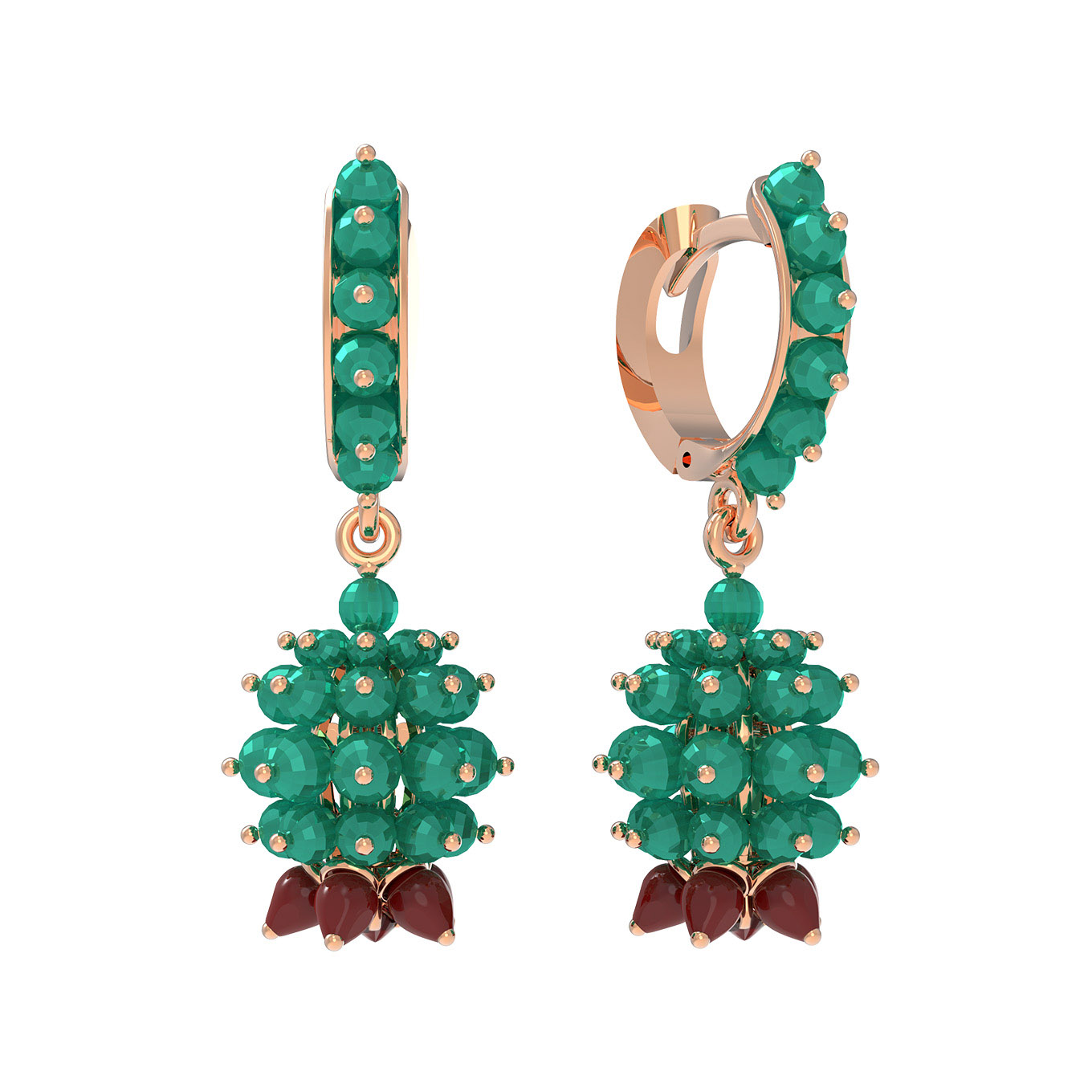 Серьги из красного золота 585 пробы c гранатом, хризопразом и кораллом