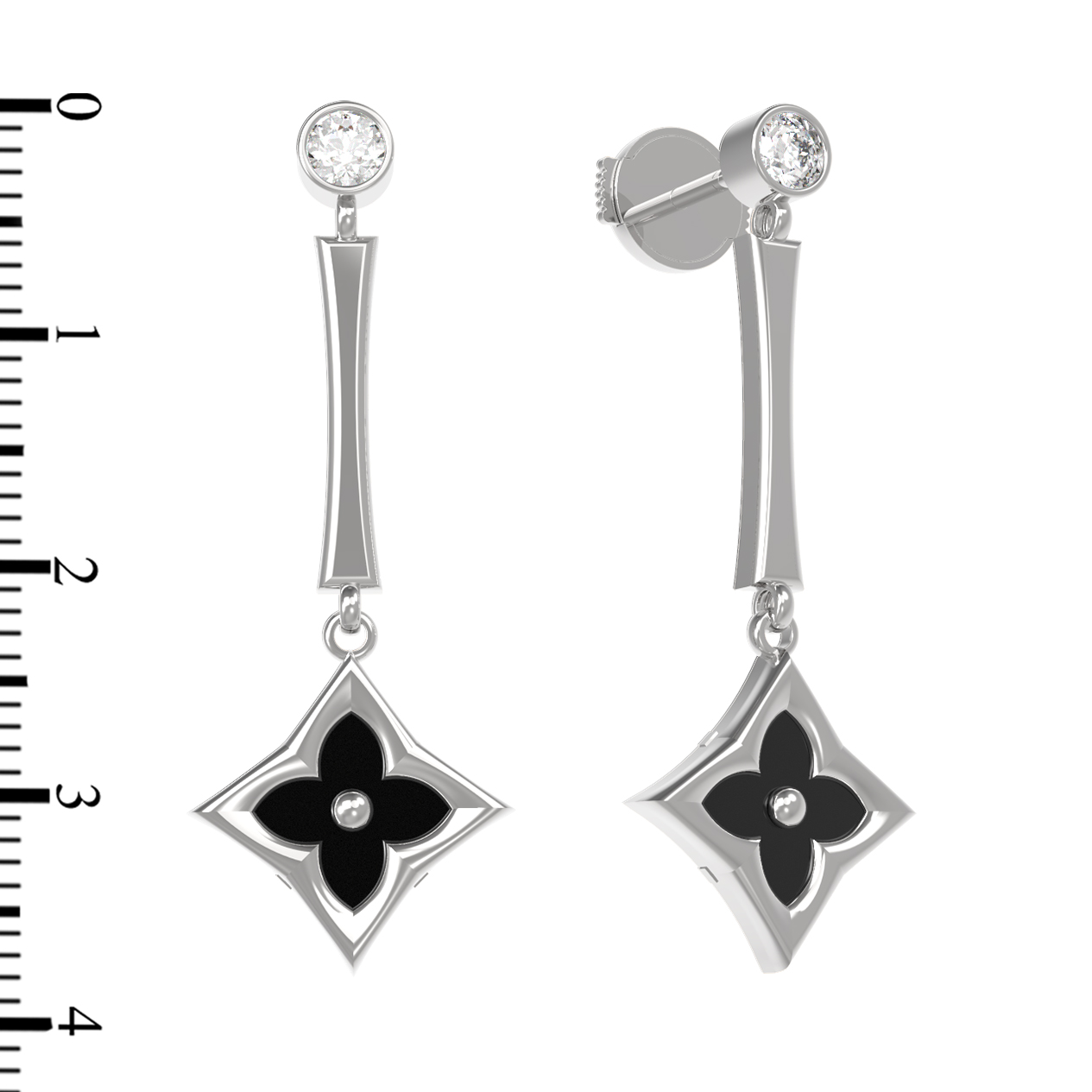 Дизайн модели вдохновлен эстетикой клевера, которая прослеживается в подвесной части. В украшении использованы 4 вставки: глубокий черный оникс в форме ромба, обрамленный безупречной огранкой, создает выразительный контраст с сияющим белым фианитом круглой формы в верхней части. Сочетание черного и белого цветов делает серьги универсальным аксессуаром, который легко вписывается в различные стилистические решения — от делового костюма до вечернего наряда.