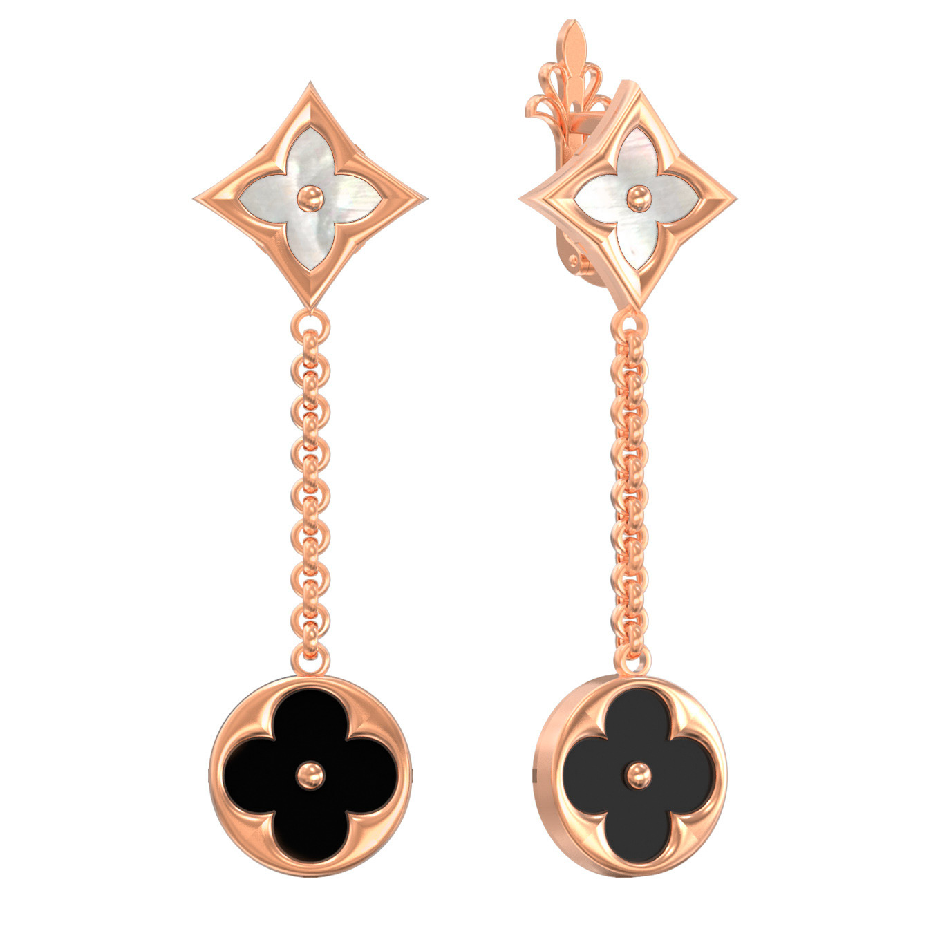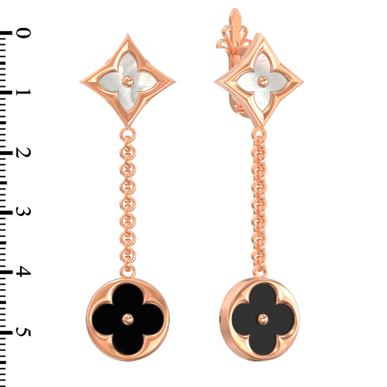 Конструкция изделия отличается филигранной работой ювелиров. В верхней части композиции расположен ромбовидный элемент, инкрустированный нежным перламутром с мягким сиянием. От него вниз спускается изящная золотая цепочка, завершающаяся круглым основанием с глубоким черным ониксом. Контрастное сочетание светлого перламутра и насыщенного оникса в обрамлении красного золота создает гармоничную игру цветов, привлекая внимание к лицу и подчеркивая статус обладателя.