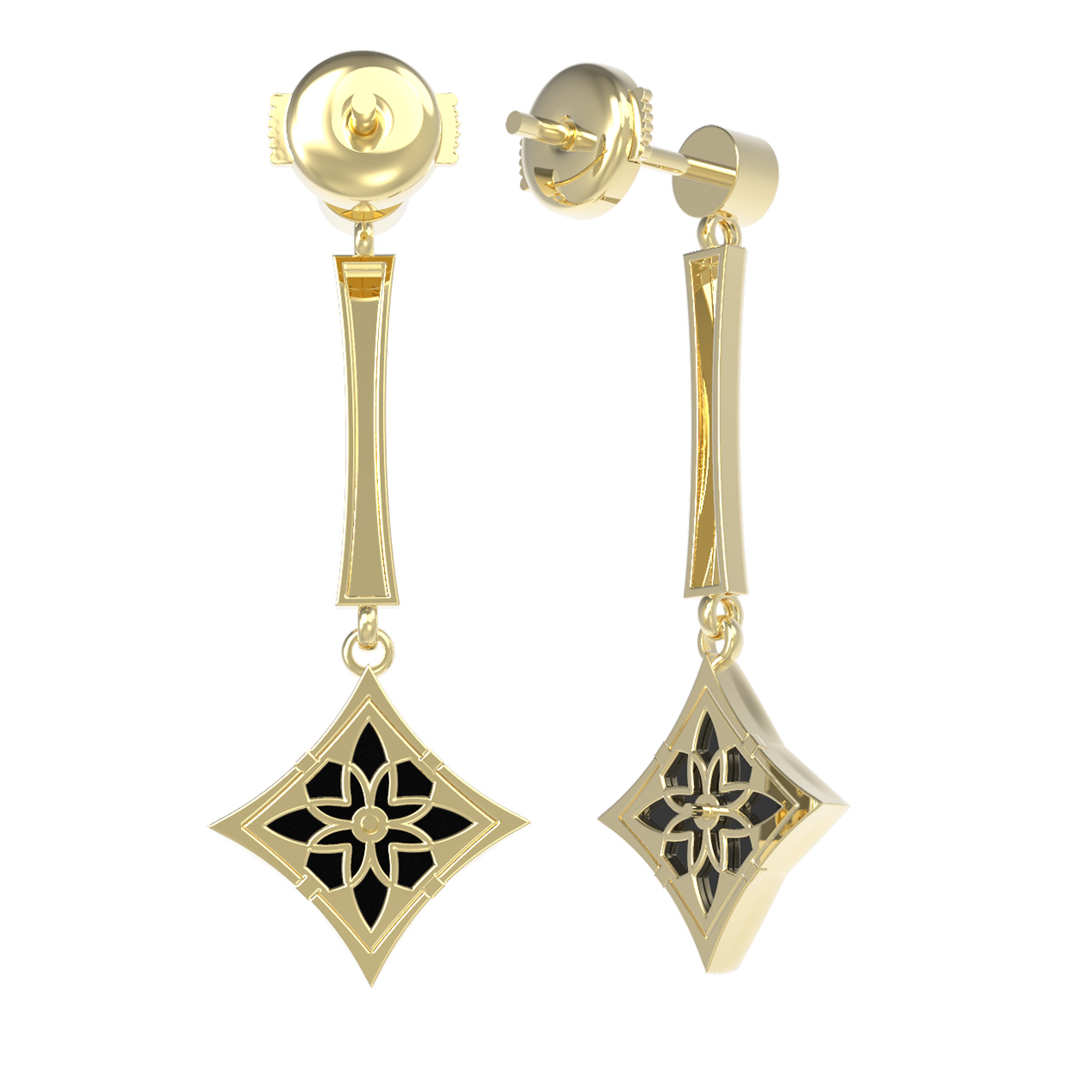 Основой дизайна выступает изысканная форма клевер, которая давно стала символом утонченности в ювелирном искусстве. Композиция дополнена контрастным сочетанием материалов: глубокий черный оникс в форме ромба великолепно гармонирует с сияющим белым фианитом круглой огранки. Всего в изделии использованы 4 вставки, которые создают эффектный визуальный баланс.