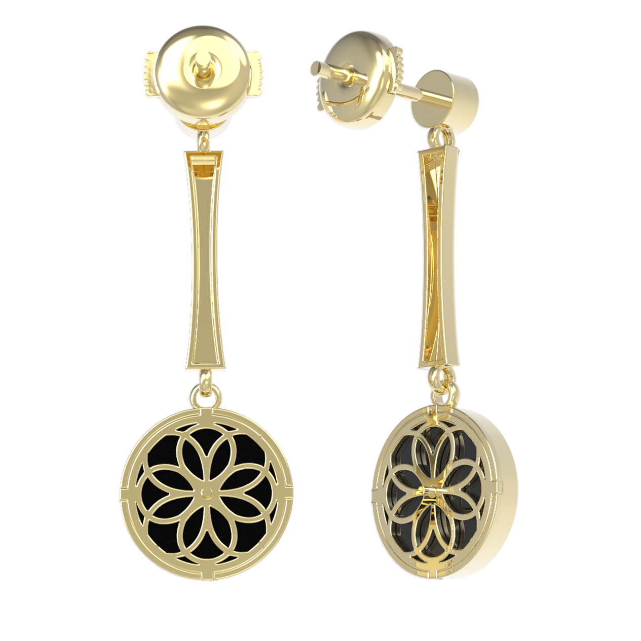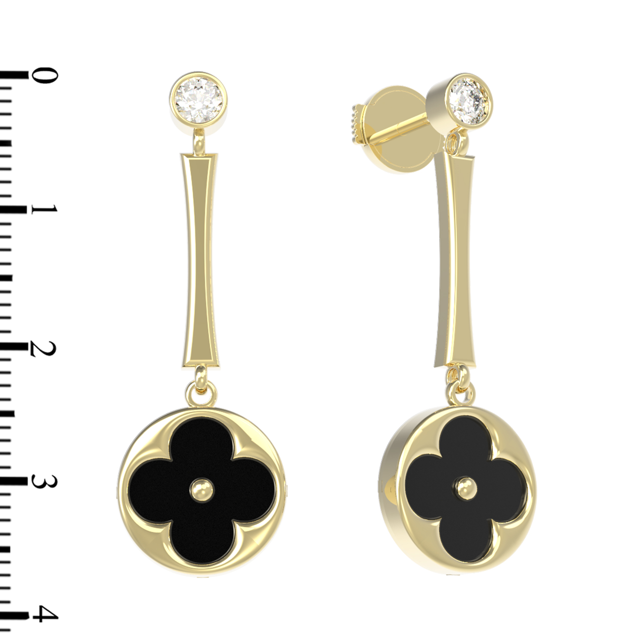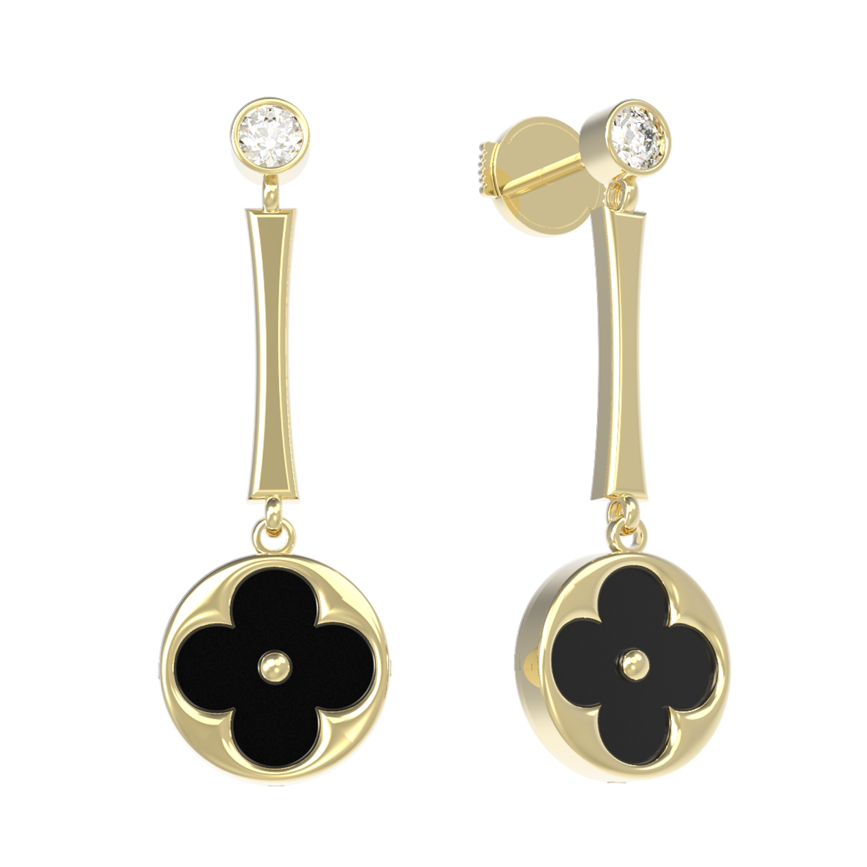 Композиция украшения строится на контрастном сочетании благородных материалов. Центром внимания становится вставка из оникса черного цвета, которая эффектно выделяется на фоне теплого сияния лимонного золота. Дополнительный акцент создают 4 вставки из фианита белого цвета круглой формы, которые мягко переливаются при каждом движении, добавляя изделию благородного блеска. Сочетание глубокого черного оникса и прозрачного сияния фианита делает серьги выразительными и статусными.