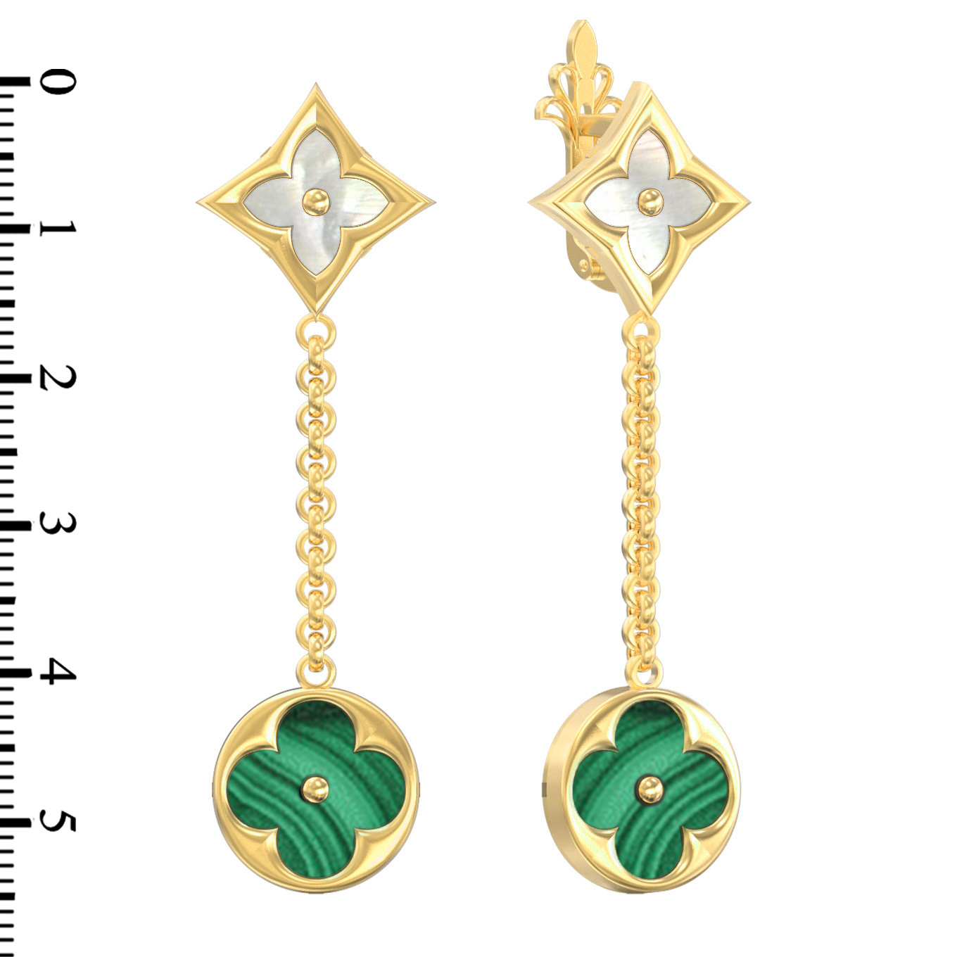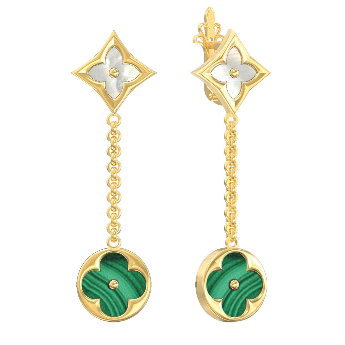 В центре внимания — две вставки: глубокий зеленый малахит круглой формы и нежный перламутр ромбовидной формы. Контраст между насыщенным малахитом и сияющим перламутром подчеркивает премиальность изделия, делая его универсальным дополнением к любому образу. Эти серьги созданы для тех, кто ценит эстетику и качество в каждой детали.