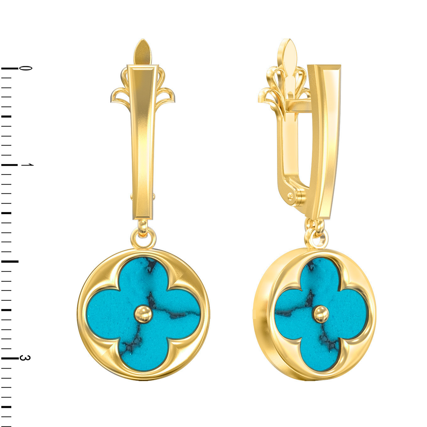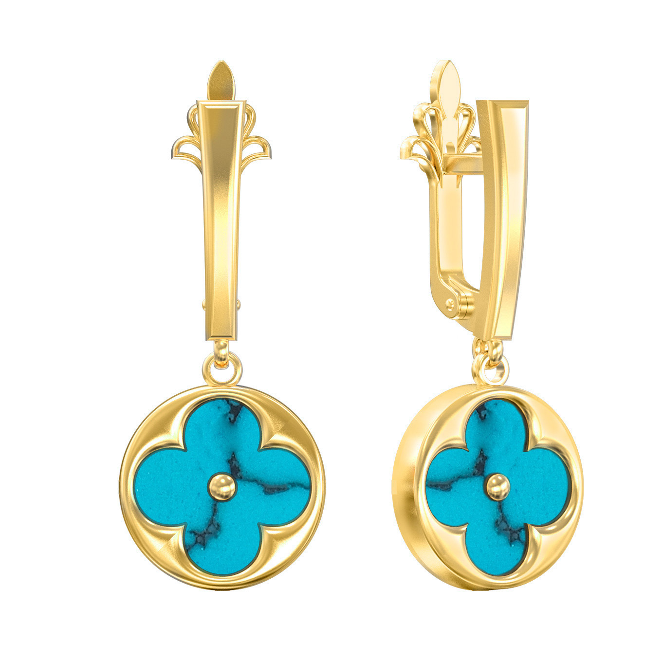 Центральным элементом композиции стал изысканный дизайн в форме клевера — символа удачи и благополучия. В каждой серьге расположено по одной вставке из натуральной бирюзы. Небесно-голубой цвет камня с уникальным природным рисунком эффектно контрастирует с золотым обрамлением, создавая выразительный и запоминающийся образ. Круглая форма вставок гармонично вписана в общую геометрию украшения.