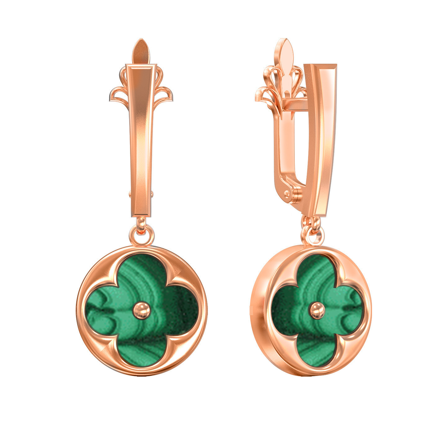 В центре композиции расположены две вставки из натурального малахита. Зеленый цвет вставок круглой формы идеально гармонирует с теплым оттенком красного золота, создавая яркий и запоминающийся контраст. Глубокий, природный узор малахита делает каждую пару серег уникальной, подчеркивая индивидуальность их обладателя. Это украшение станет великолепным акцентом в любом образе, добавляя ему нотки роскоши и стиля.