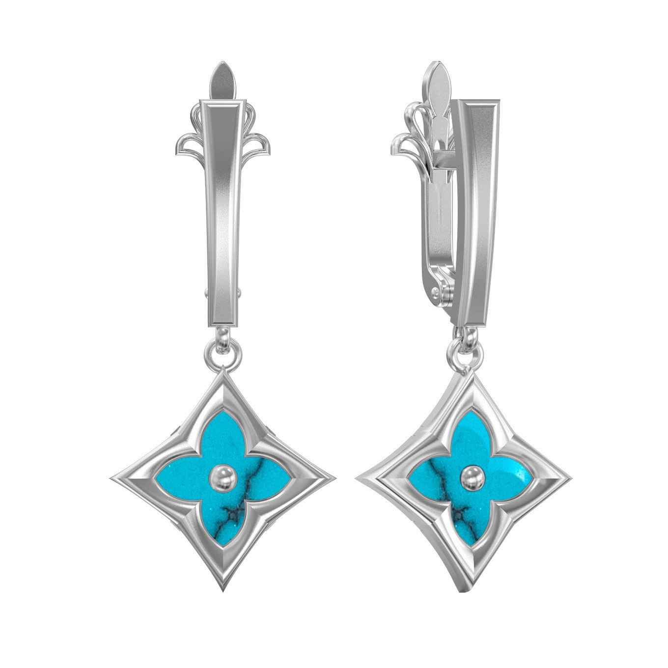 Элегантность и утонченность объединились в этих восхитительных серьгах из белого золота 585 пробы. Украшение является частью ювелирной линии De Luxe — Амальфи, вдохновленной эстетикой средиземноморского побережья. В центре внимания — изысканный дизайн в форме клевера, придающий образу нотки аристократичности и природной грации. Холодный блеск благородного металла идеально сочетается с ярким, насыщенным цветом вставок из натуральной бирюзы, чья необычная ромбовидная форма подчеркивает мастерство ювелиров.