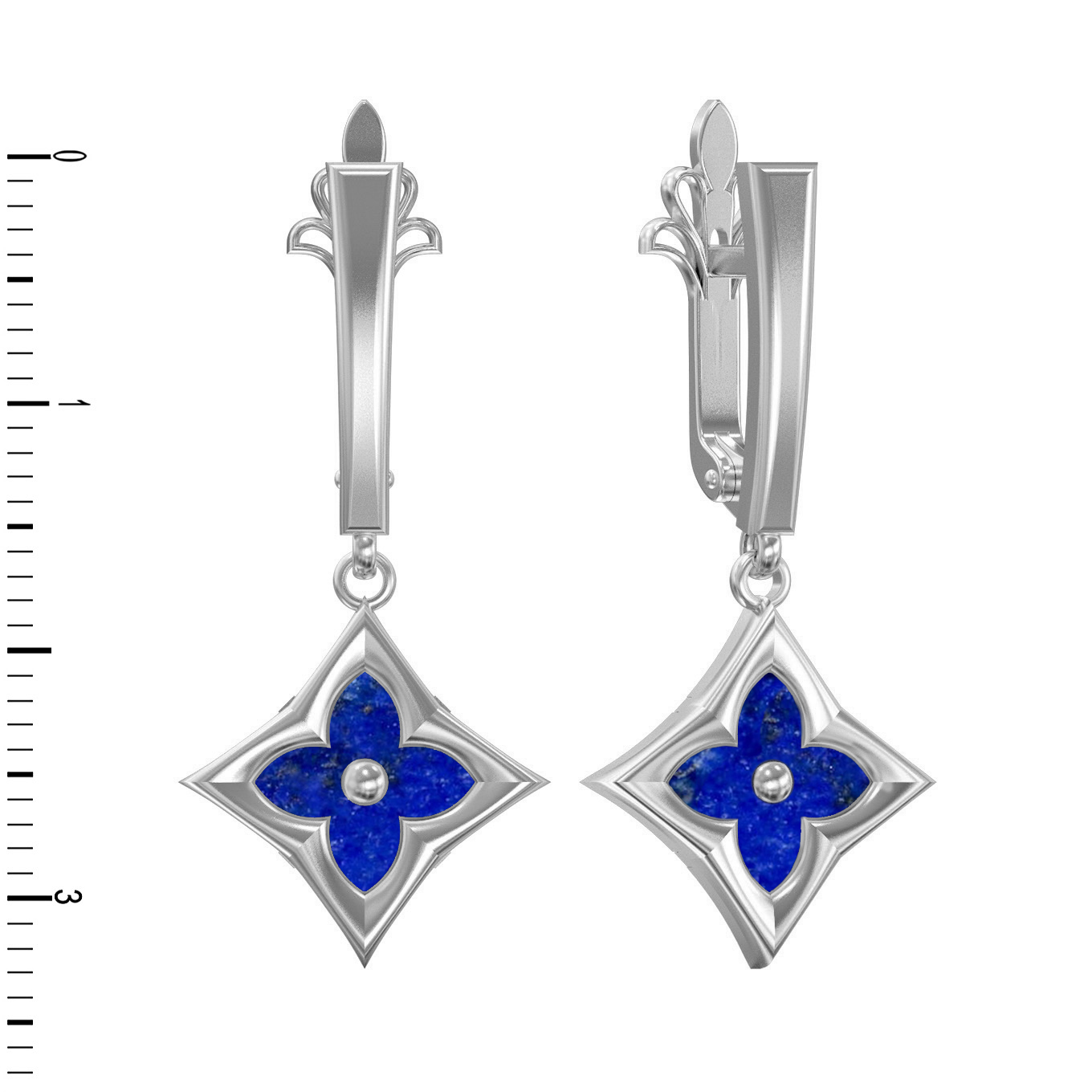 Каждая серьга дополнена вставкой из благородного лазурита насыщенного синего цвета. Форма вставок в виде ромба подчеркивает лаконичность линий и создает эффектное контрастное сочетание с холодным блеском металла. Общее количество вставок в изделии — 2. Использование белого золота придает украшению благородный оттенок, который идеально подходит как женщинам, так и мужчинам, предпочитающим минимализм и строгую эстетику.