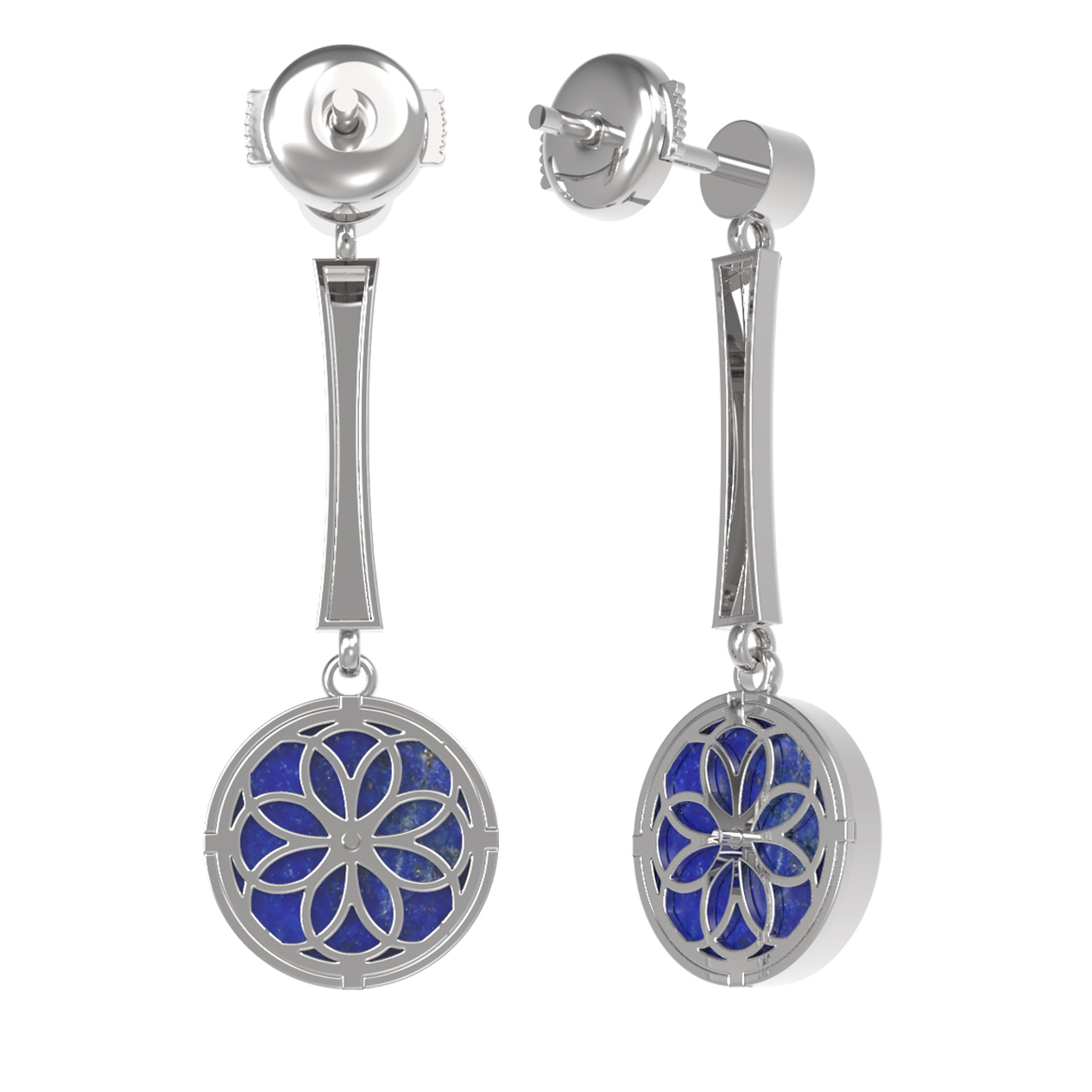 В центре композиции гармонично расположились 4 вставки круглой формы: насыщенный синий лазурит эффектно контрастирует с сияющим белым фианитом, расположенным в верхней части серьги. Такое сочетание материалов создает выразительный акцент, притягивающий взгляды. Благодаря продуманной форме и лаконичному исполнению, серьги из белого золота с фианитом и лазуритом станут универсальным выбором для создания стильных комплектов.