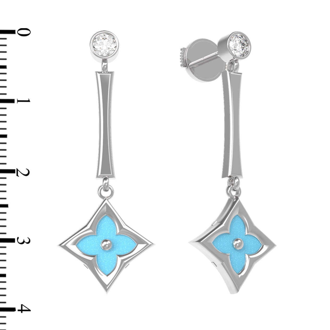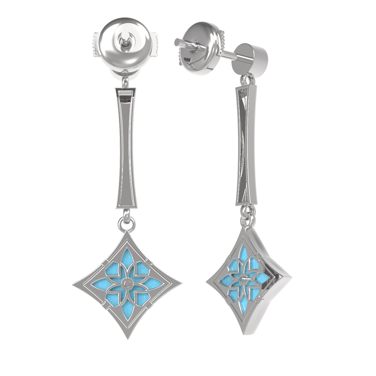 В центре композиции расположена яркая бирюза небесно-бирюзового цвета, чья природная красота дополнена сияющим прозрачным фианитом. Использование двух видов огранки и форм вставок — круглого фианита и ромбовидного элемента с бирюзой — придает серьгам динамику и глубину. Общее количество вставок составляет 4 штуки, что создает сбалансированный и гармоничный облик украшения.