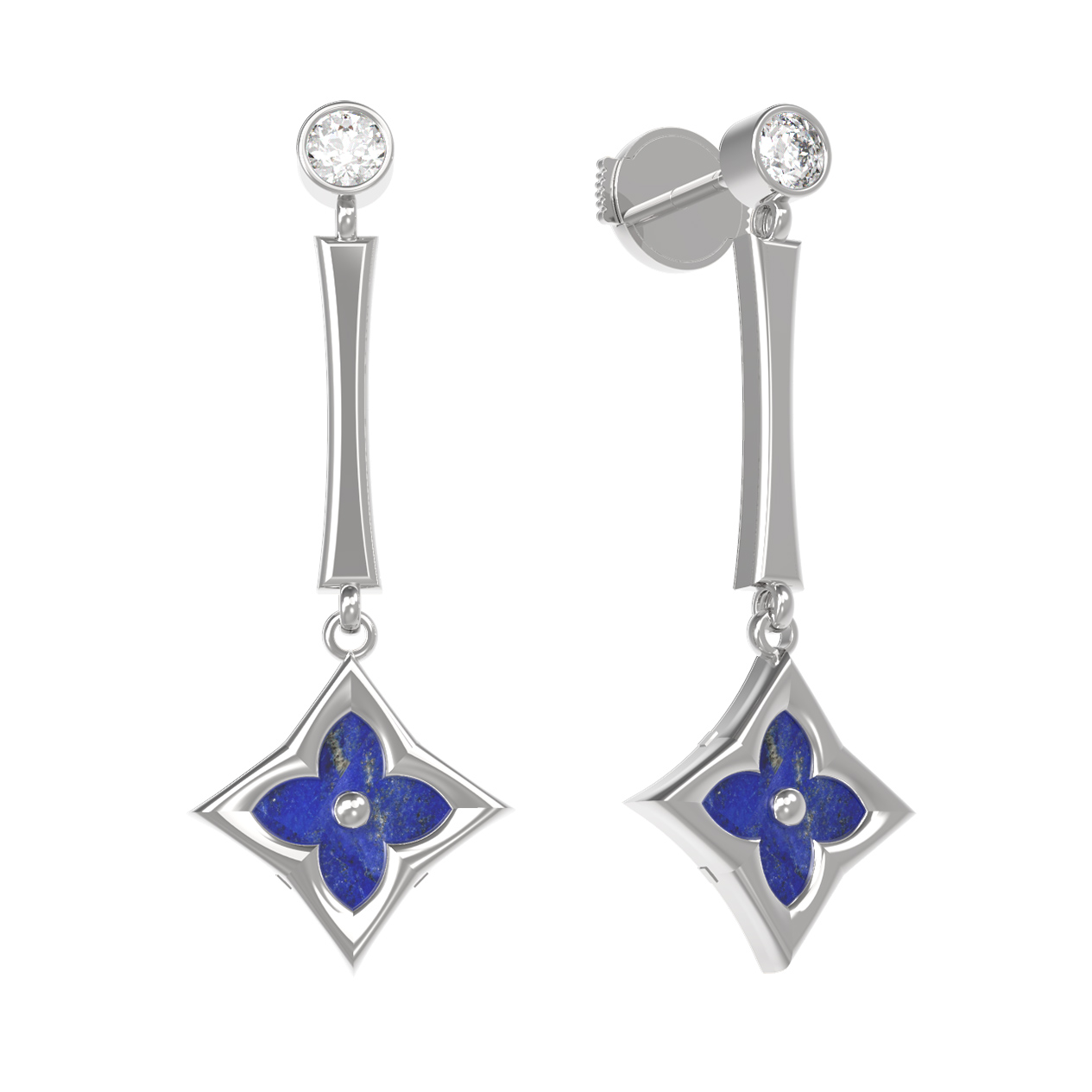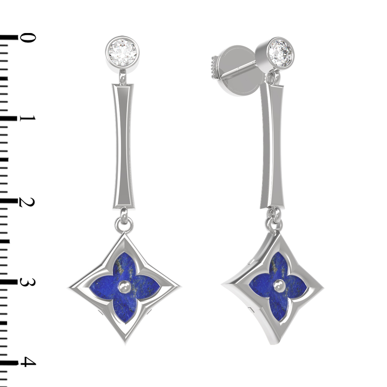 Элегантные серьги из белого золота 585 пробы — гармоничное сочетание классики и современной ювелирной эстетики. Дизайн изделия вдохновлен культовым мотивом клевера, который придает украшению особое очарование и узнаваемый силуэт. Центральным элементом композиции стали вставки из натурального лазурита глубокого синего цвета, выполненные в форме ромба. Этот насыщенный оттенок эффектно контрастирует с холодным блеском драгоценного металла и ярким сиянием белых фианитов круглой формы.