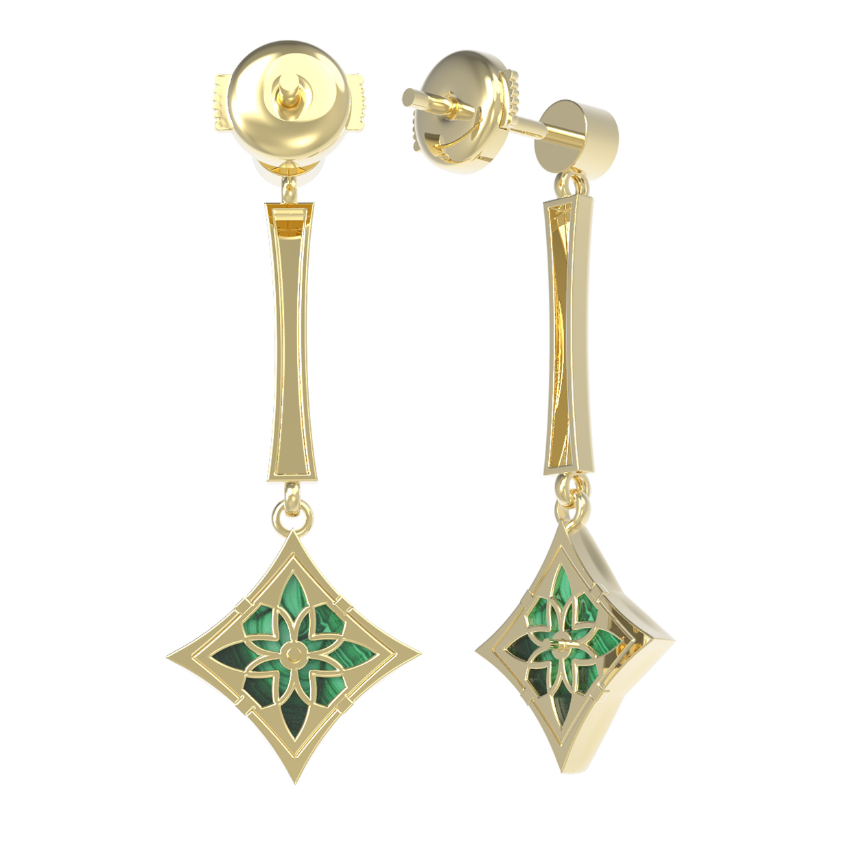 Элегантные и выразительные серьги из лимонного золота 585 пробы станут изысканным акцентом вашего образа. Дизайн украшения вдохновлен эстетикой флористических мотивов: в центре внимания находится узнаваемый символ клевера, выполненный с безупречной геометрической точностью. Ромбовидная форма подвесной части гармонично сочетается с насыщенным зеленым оттенком малахита, который добавляет изделию природной глубины и благородства.