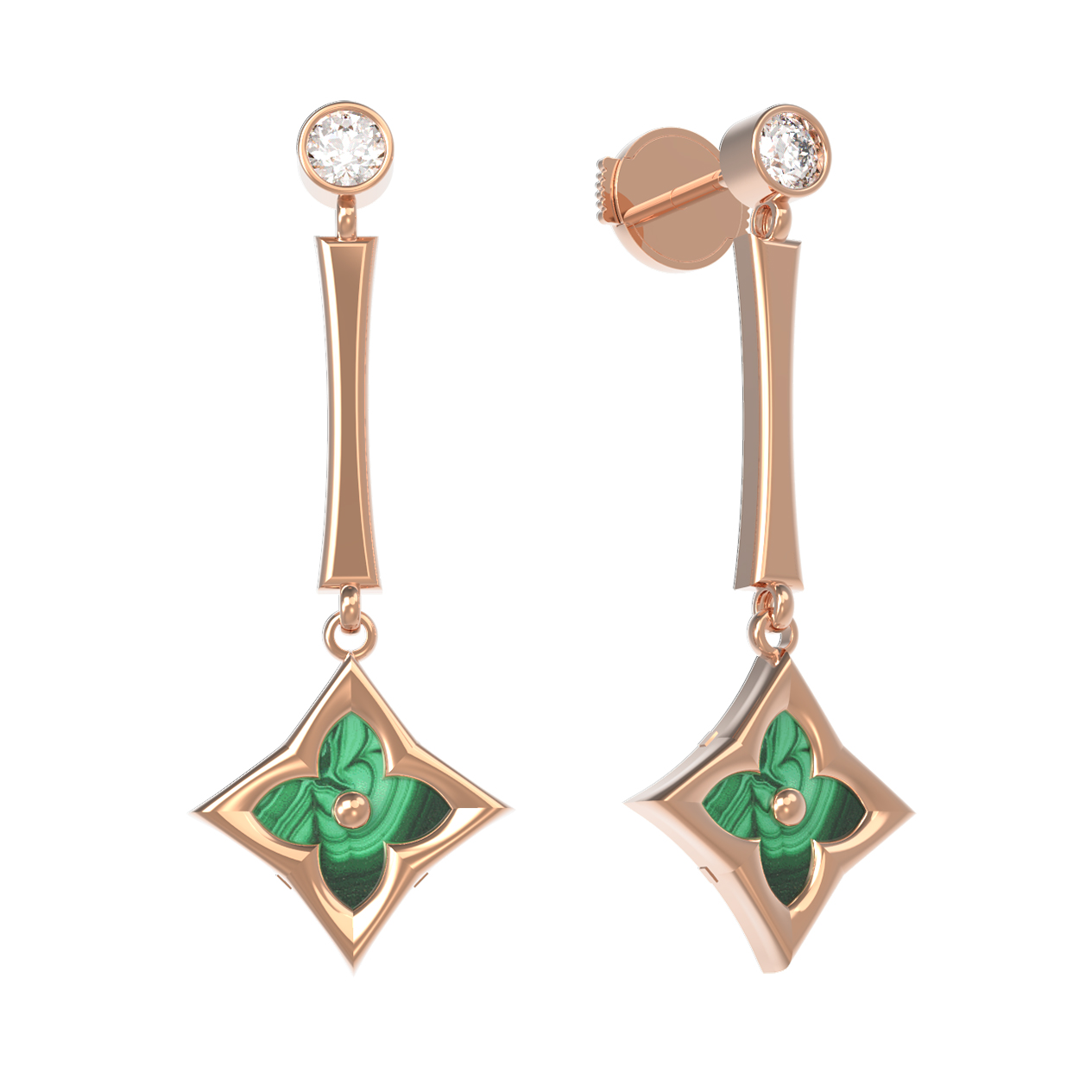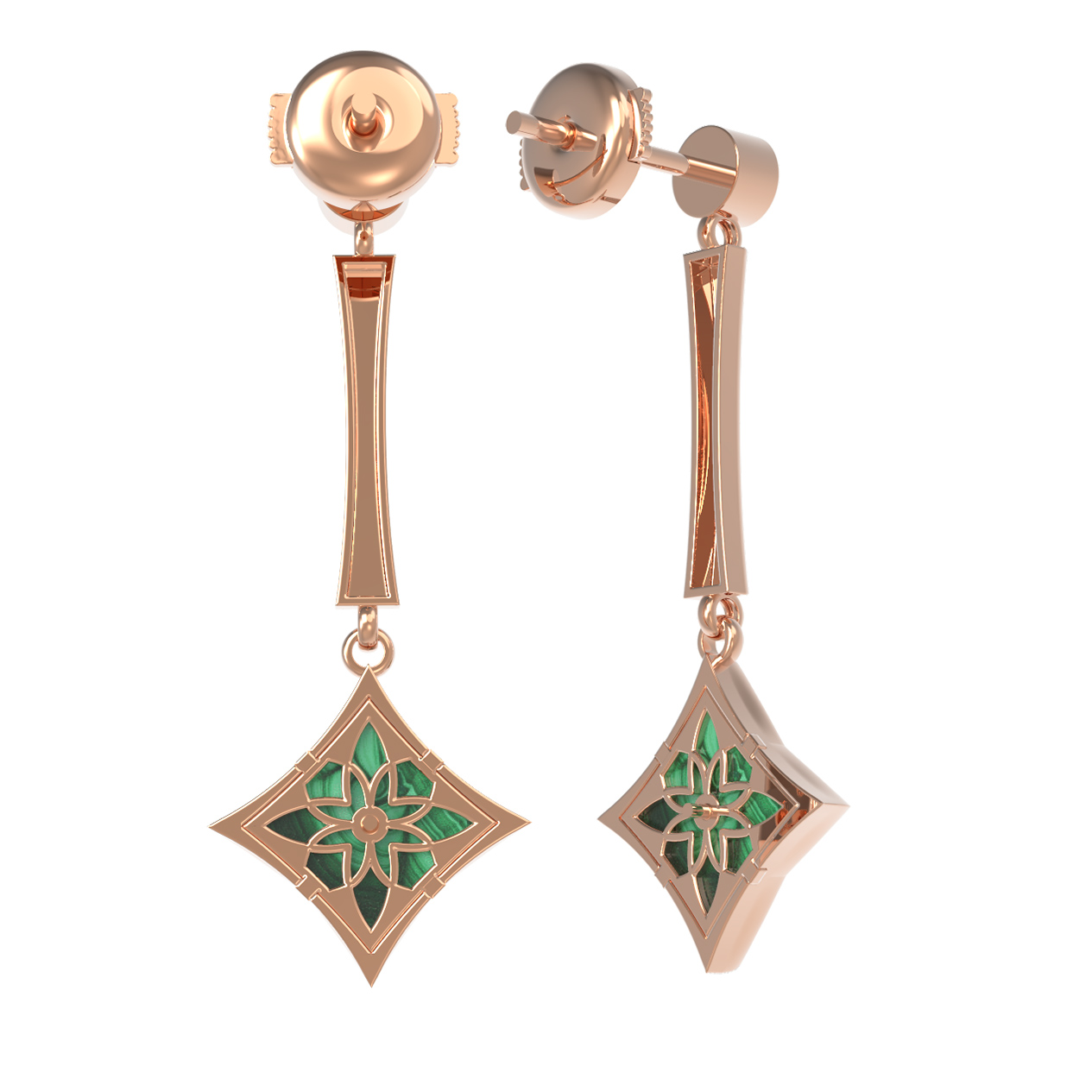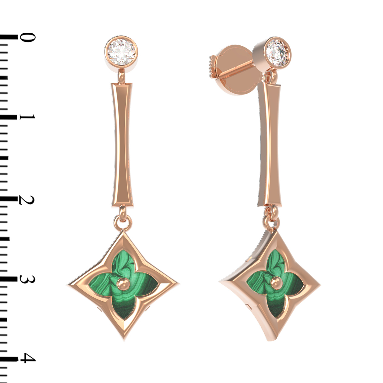 Центральным элементом композиции является насыщенный зеленый малахит ромбовидной формы. Этот природный камень обладает неповторимым рисунком, придающим украшению особую глубину. В дополнение к нему использованы сверкающие фианиты белого цвета круглой формы, которые создают эффектное сияние при каждом движении. Всего в дизайне использовано 4 вставки, гармонично сочетающихся с теплым оттенком драгоценного металла.