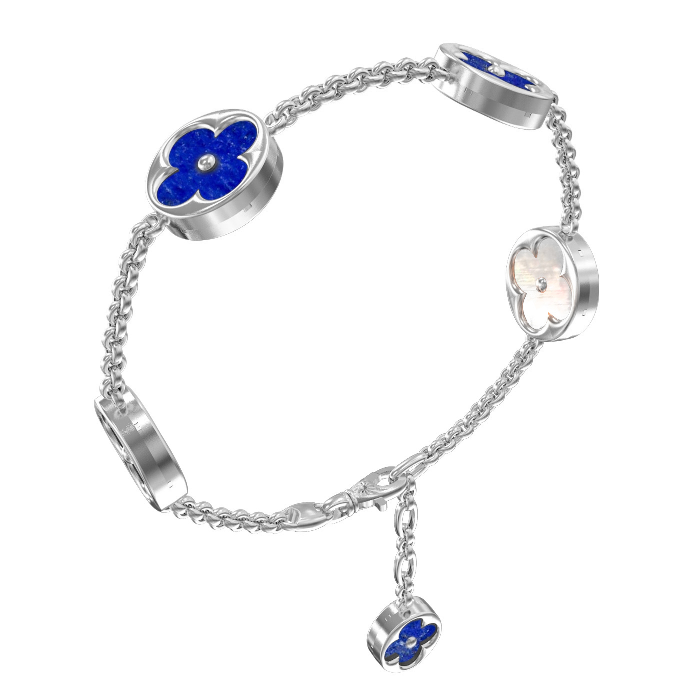 Изысканный браслет из коллекции De Luxe — Амальфи станет воплощением утонченного вкуса и безупречного стиля. Это украшение выполнено из качественного белого золота 585 пробы, чей холодный блеск идеально сочетается с глубоким синим цветом вставок из лазурита и нежным сиянием перламутра. Дизайн изделия вдохновлен природной эстетикой и строится вокруг узнаваемого мотива клевера, который придает украшению особое очарование.
