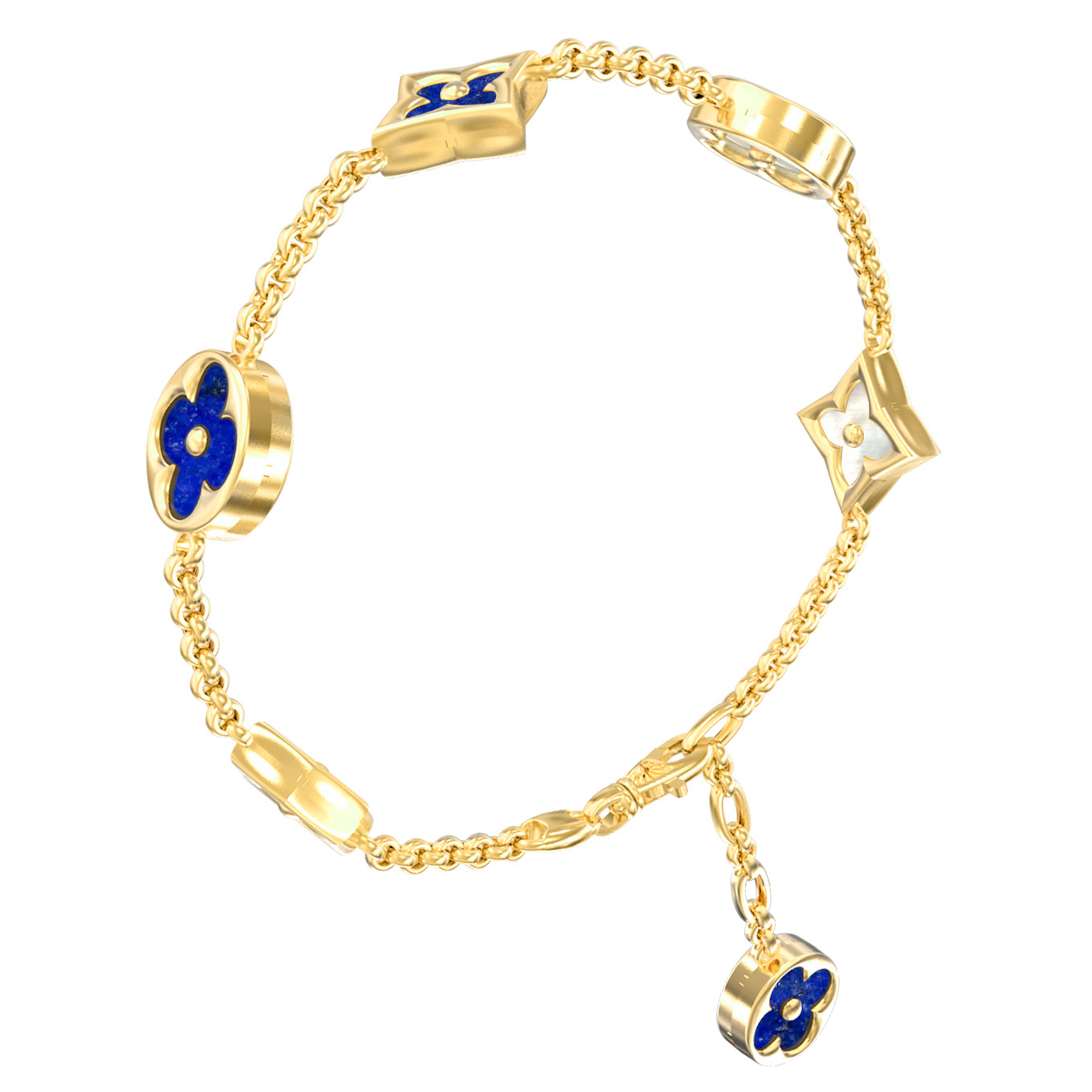 Оригинальная комбинация круглых и ромбовидных элементов создает динамичный и современный образ. Качественное лимонное золото служит идеальной оправой для контрастных вставок: насыщенный синий лазурит эффектно сочетается с мягким перламутром, формируя стильный акцент на запястье. Этот браслет одинаково гармонично дополнит как женский, так и мужской образ, подчеркивая индивидуальность и безупречный вкус владельца.