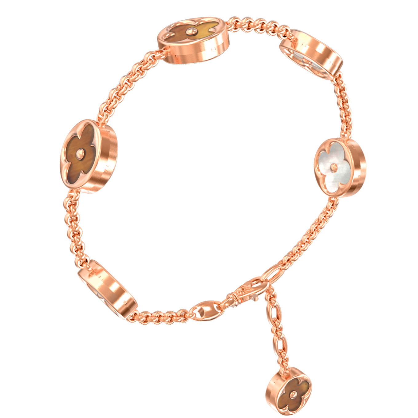 В оформлении браслета использовано сочетание натуральных вставок: притягательного тигрового глаза оранжевого оттенка и нежного перламутра. Каждая вставка имеет аккуратную круглую форму, что подчеркивает симметрию и эстетическую завершенность украшения. Красный цвет золотого сплава подчеркивает теплое сияние вставок, создавая роскошный контраст. Этот браслет — самодостаточный аксессуар, однако он отлично сочетается с другими ювелирными изделиями, позволяя создавать полноценные комплекты для любого случая. Если вы ищете подарок, который подчеркнет ваш стиль и статус, это изделие станет отличным выбором.