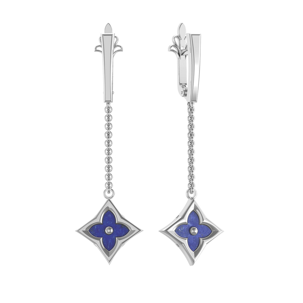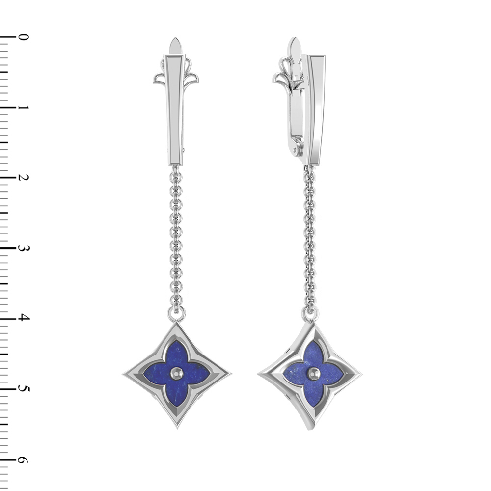 Ключевым элементом украшения выступает вставка из насыщенного лазурита. Глубокий синий цвет камня гармонично контрастирует с белым золотом, создавая выразительный визуальный эффект. Дизайн в форме клевера — это вечная классика, которая добавляет серьгам символичности и легкости. Лазурит в каждой из двух вставок имеет геометрически выверенную форму ромба, что подчеркивает современные линии ювелирного изделия.