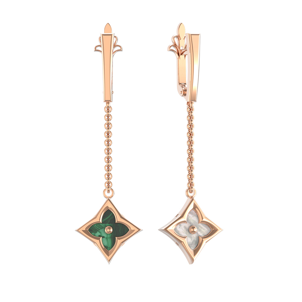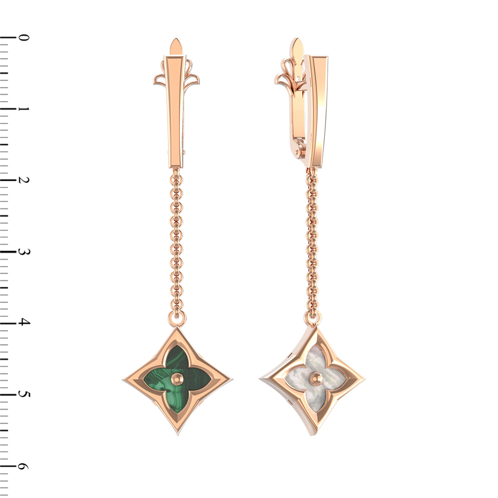 Серьги из красного золота 585 пробы c малахитом и перламутром