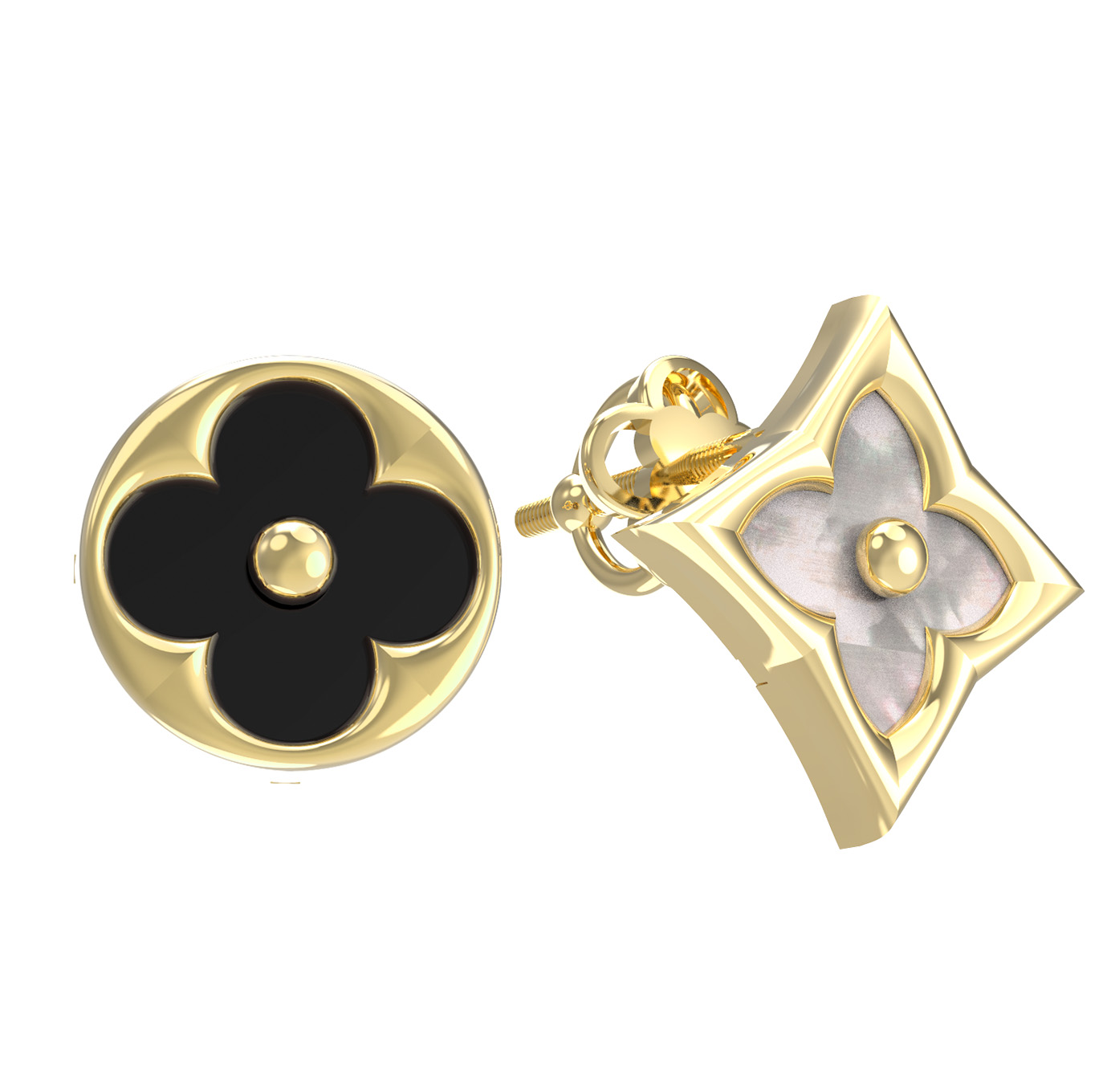 Особое внимание привлекает игра контрастов: вставки из глубокого черного оникса и нежного перламутра создают гармоничный тандем. Формы вставок — круг и ромб — придают украшению динамичность и современный вид, а наличие одной вставки в каждом элементе подчеркивает лаконичность композиции. Эти серьги станут великолепным дополнением к повседневному или вечернему образу, добавляя нотку роскоши и стиля.