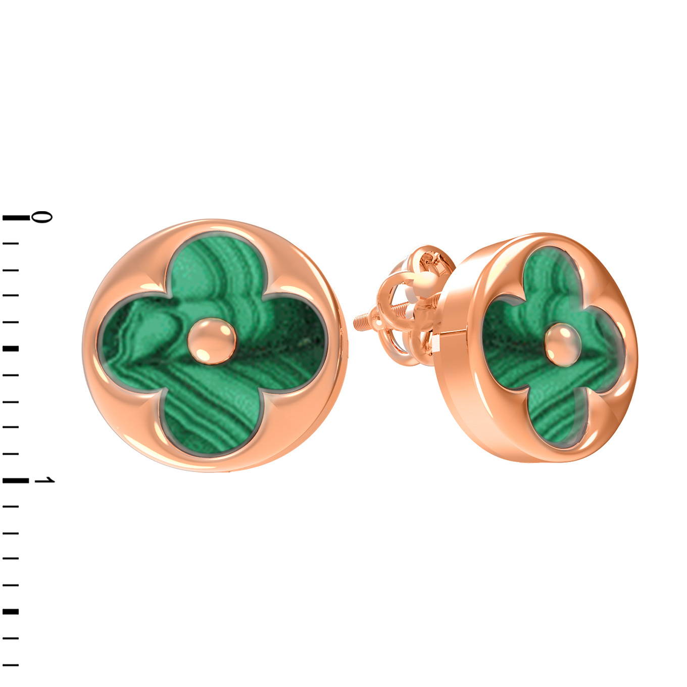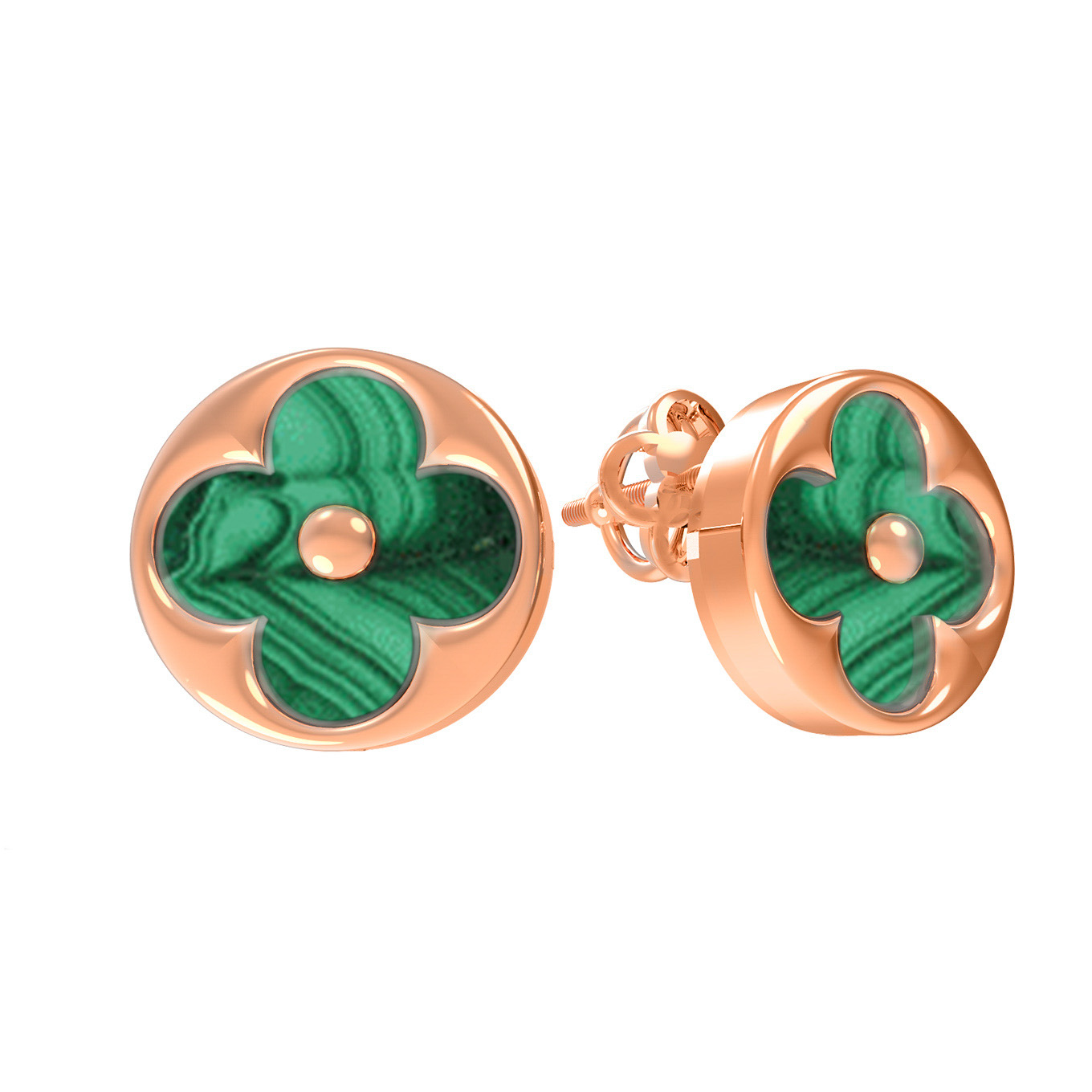 Дизайнерское решение в форме клевера придает изделию особое звучание, делая его узнаваемым и стильным акцентом вашего образа. Лаконичная форма подчеркивает безупречное качество исполнения. В каждой из двух серег использован круглый малахит, который идеально гармонирует с теплым оттенком красного золота. Это ювелирное изделие станет выразительным дополнением как повседневного делового стиля, так и вечернего выхода.