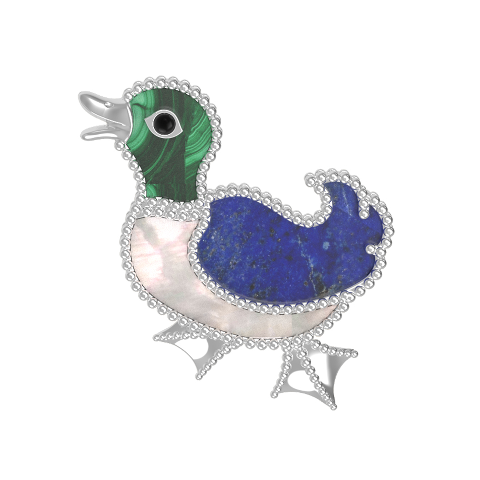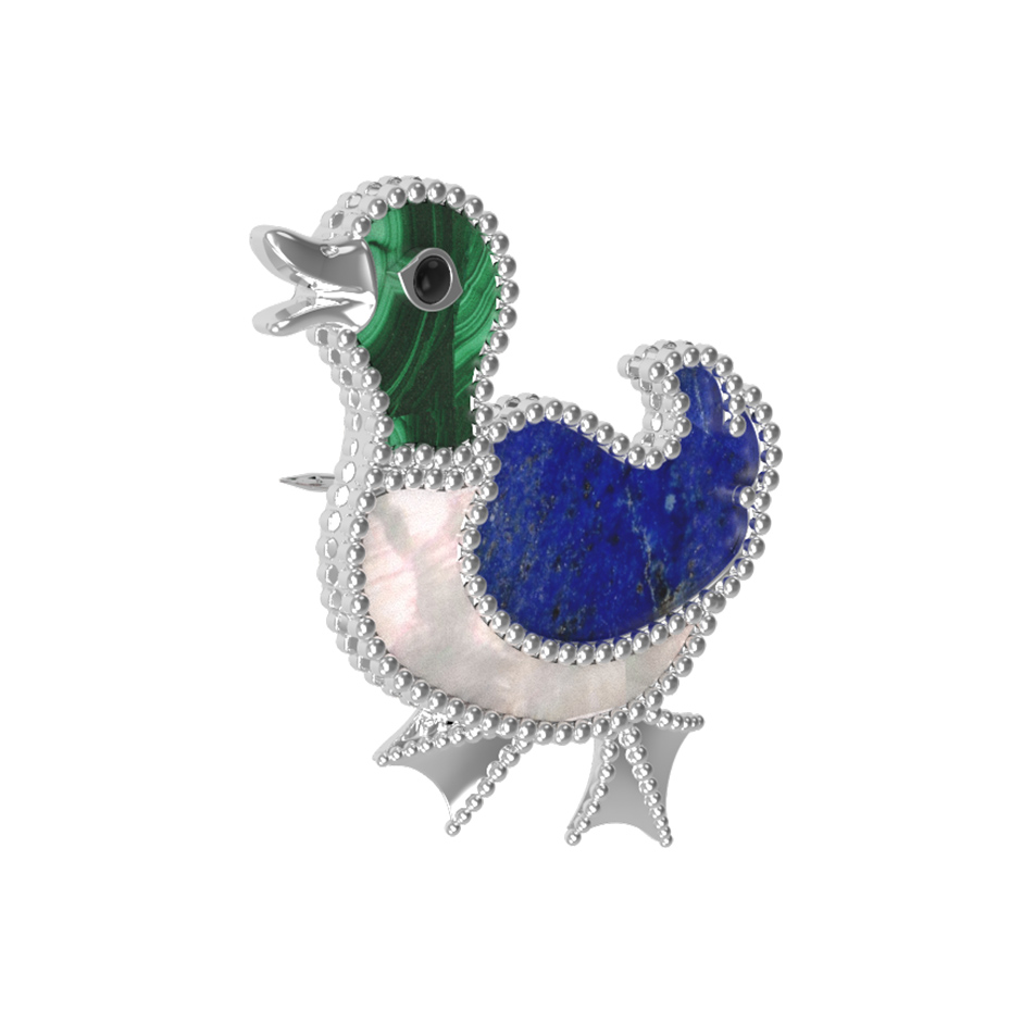 Эффектная брошь из белого золота 585 пробы станет ярким акцентом вашего образа, привнося в него нотки сказочного очарования. Дизайн изделия выполнен в виде фигурки птицы, напоминающей уточку, что делает украшение необычным и запоминающимся дополнением к коллекции De Luxe — В стране чудес. Ювелирная композиция сочетает в себе благородство металла и природную красоту камней.