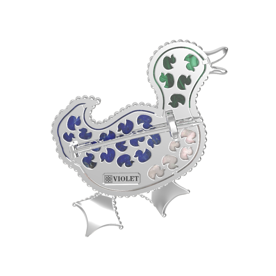 Брошь из белого золота c эмалью, лазуритом, малахитом и перламутром