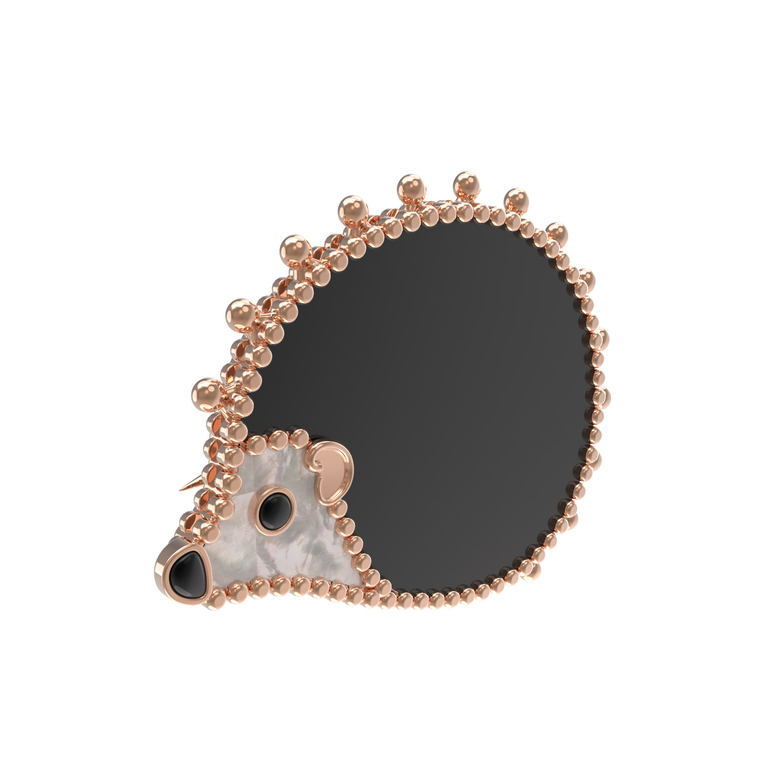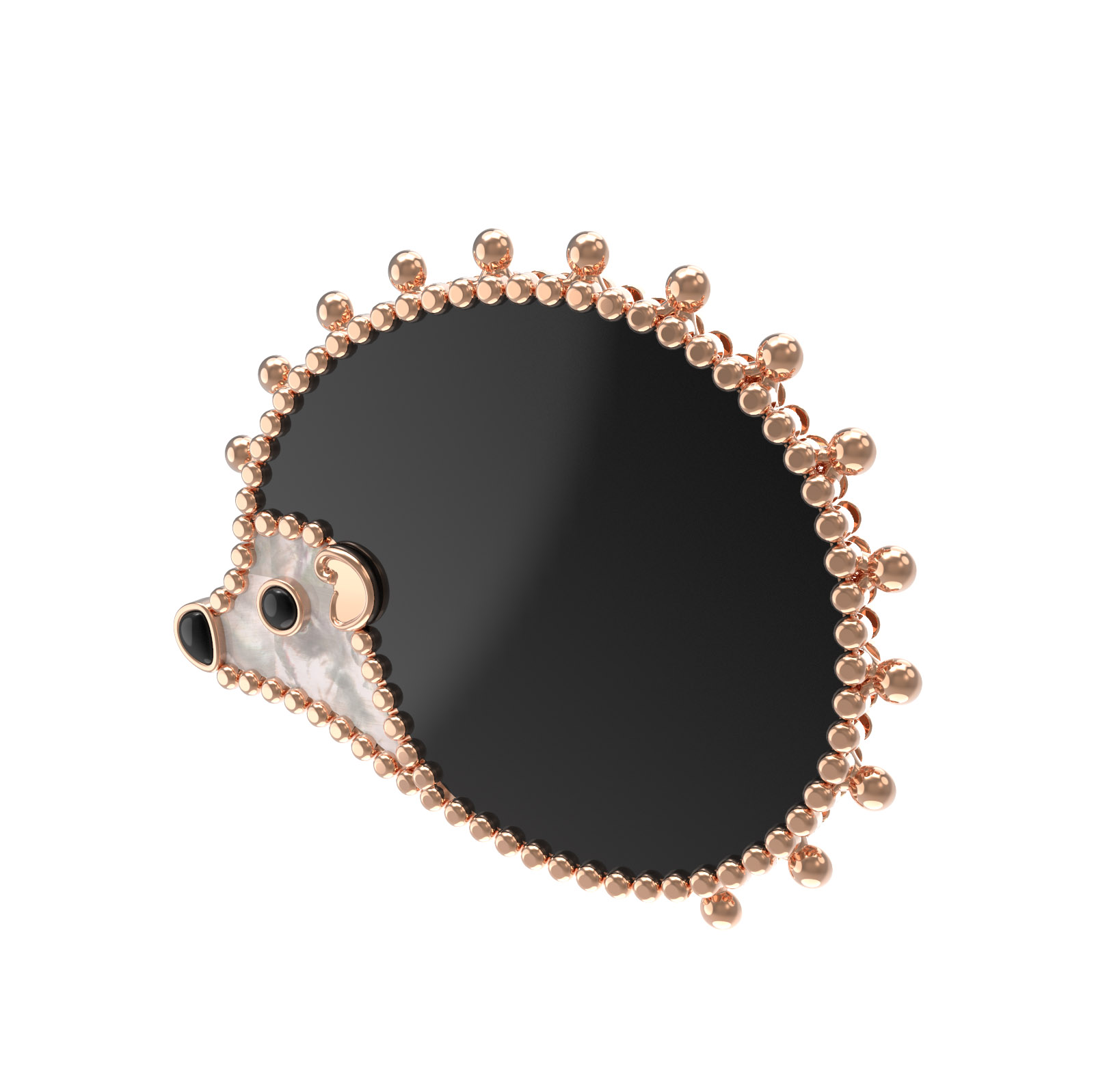 Центральную часть композиции занимает изысканная черная эмаль, контрастирующая с нежным перламутром. Вставка из глубокого оникса добавляет глубины и выразительности взгляду этого необычного ювелирного ежика. Такое сочетание фактур и цветов делает брошь самодостаточным украшением, которое привлекает внимание своей проработкой деталей.