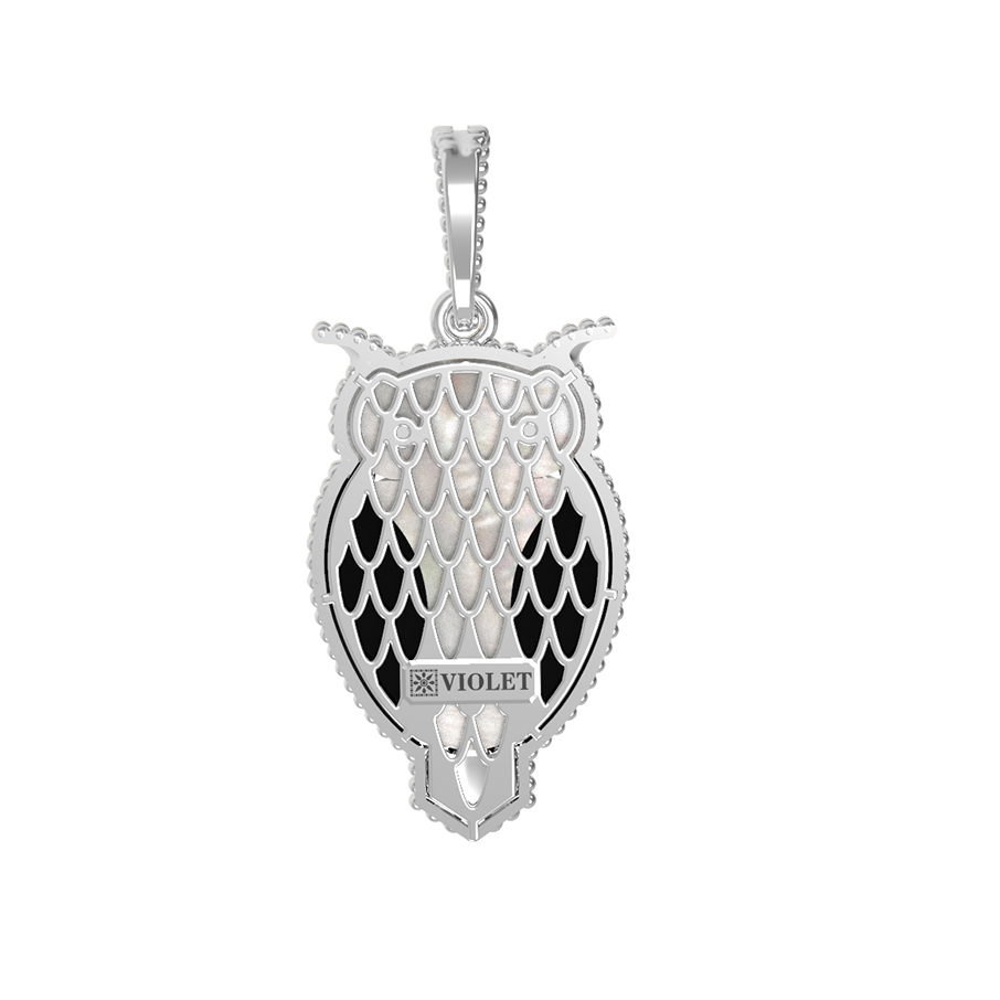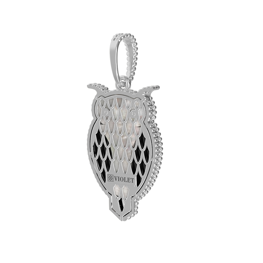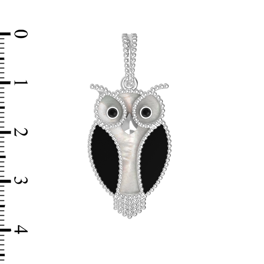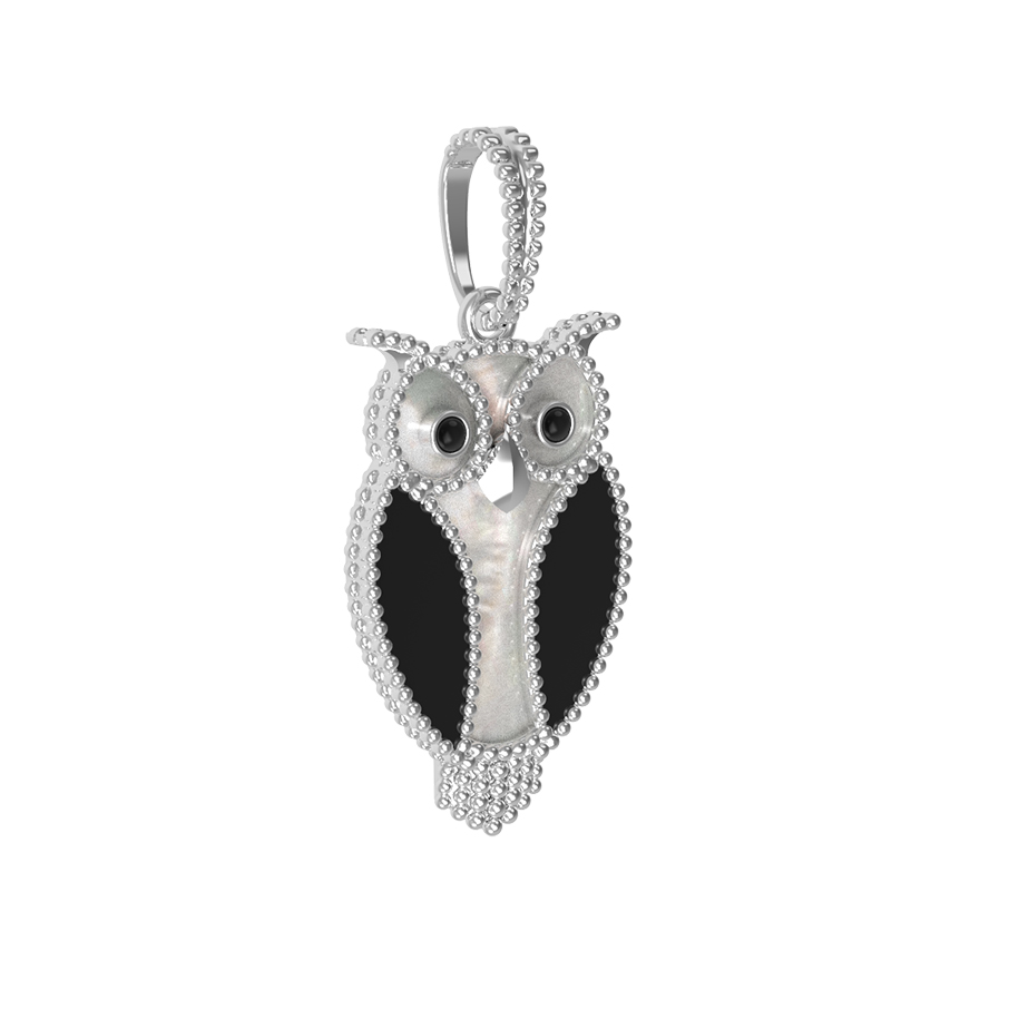 Мастерское сочетание материалов придает подвеске особый шарм: корпус совы декорирован нежным перламутром и благородным черным ониксом, что создает эффектный контраст. Эмаль добавляет украшению выразительности и четкости линий. В дизайне гармонично использованы 2 вставки формы маркиз, которые притягивают взгляд своим глубоким цветом: перламутровым и черным.