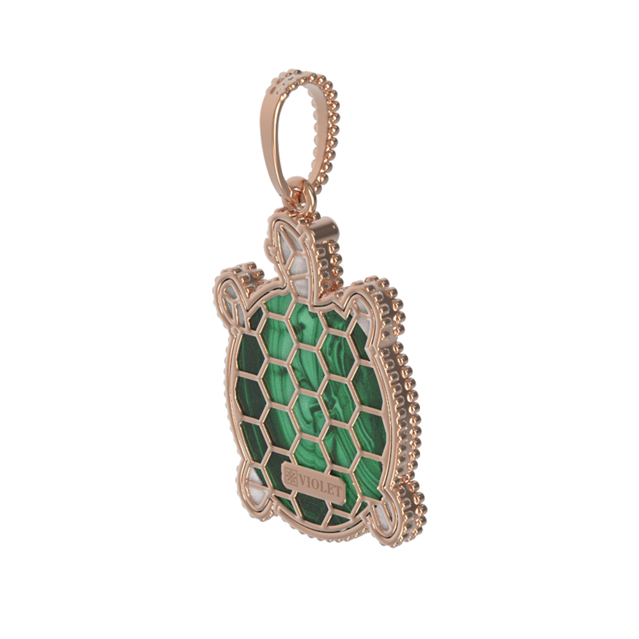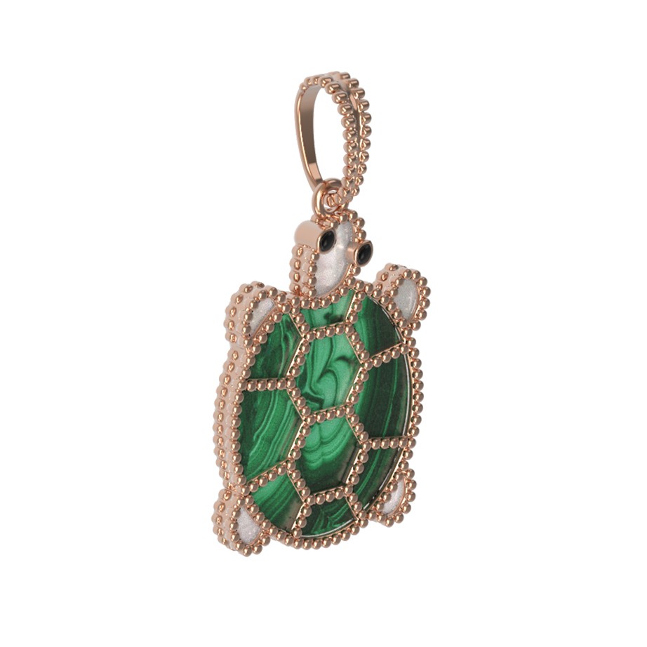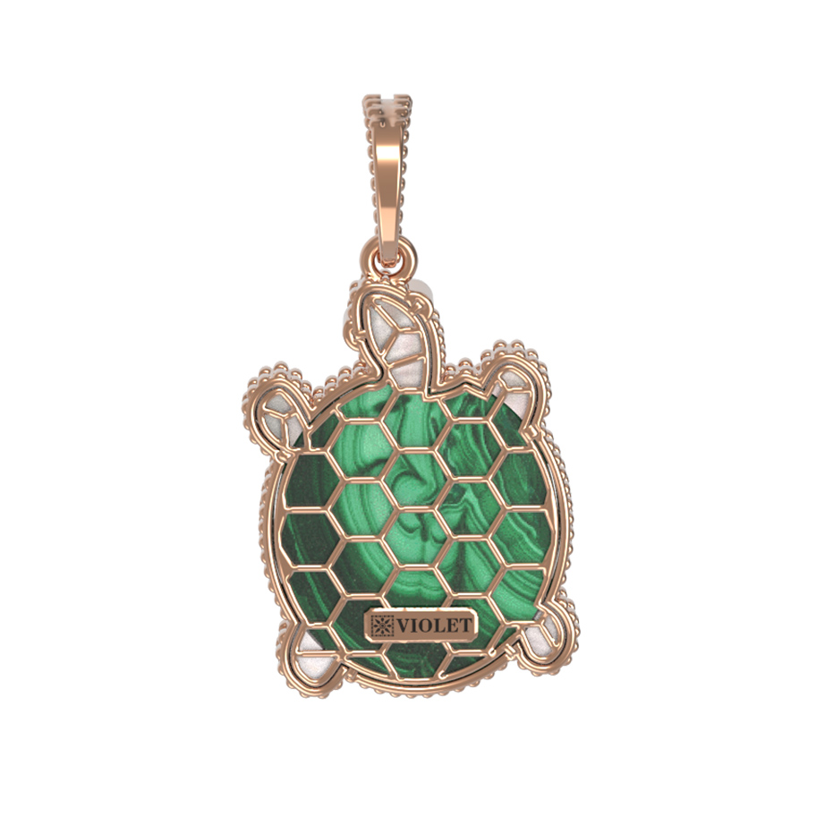 Оригинальная подвеска в виде черепахи из коллекции De Luxe — В стране чудес станет ярким акцентом вашего образа. Ювелирное изделие выполнено из красного золота 585 пробы, что обеспечивает долговечность и благородный блеск украшения. Мастерское сочетание материалов подчеркивает уникальность дизайна: панцирь черепахи декорирован натуральным малахитом насыщенного зелёного цвета, который гармонично дополняет вставка из перламутра с нежным переливом. Контраст материалов и детализация делают это украшение настоящим произведением искусства.
