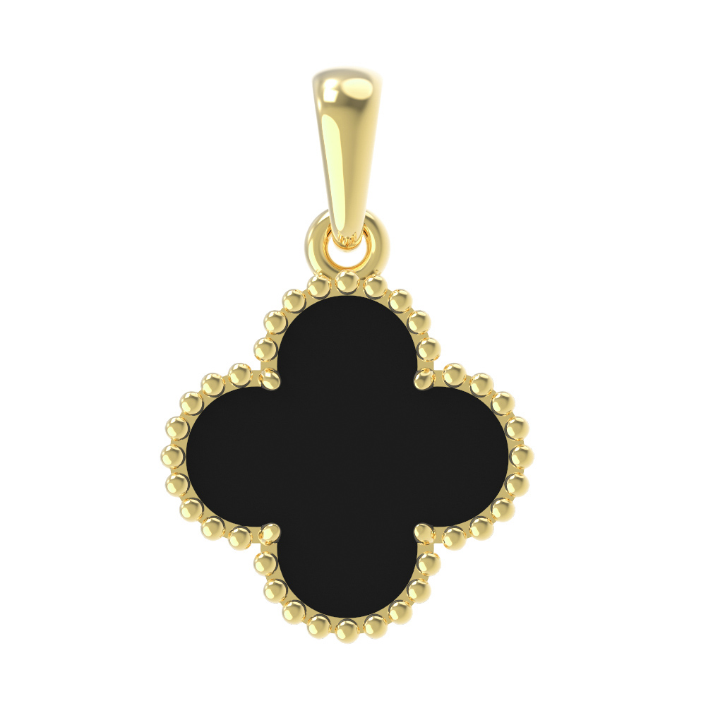Подвеска из лимонного золота 585 пробы — это воплощение элегантности и утонченного стиля. Центральным элементом украшения является изысканная вставка из черного оникса, которая глубоким, насыщенным цветом контрастирует с теплым блеском драгоценного металла. Дизайн в форме клевера придает изделию особое очарование, делая его узнаваемым аксессуаром для ценителей ювелирного искусства.