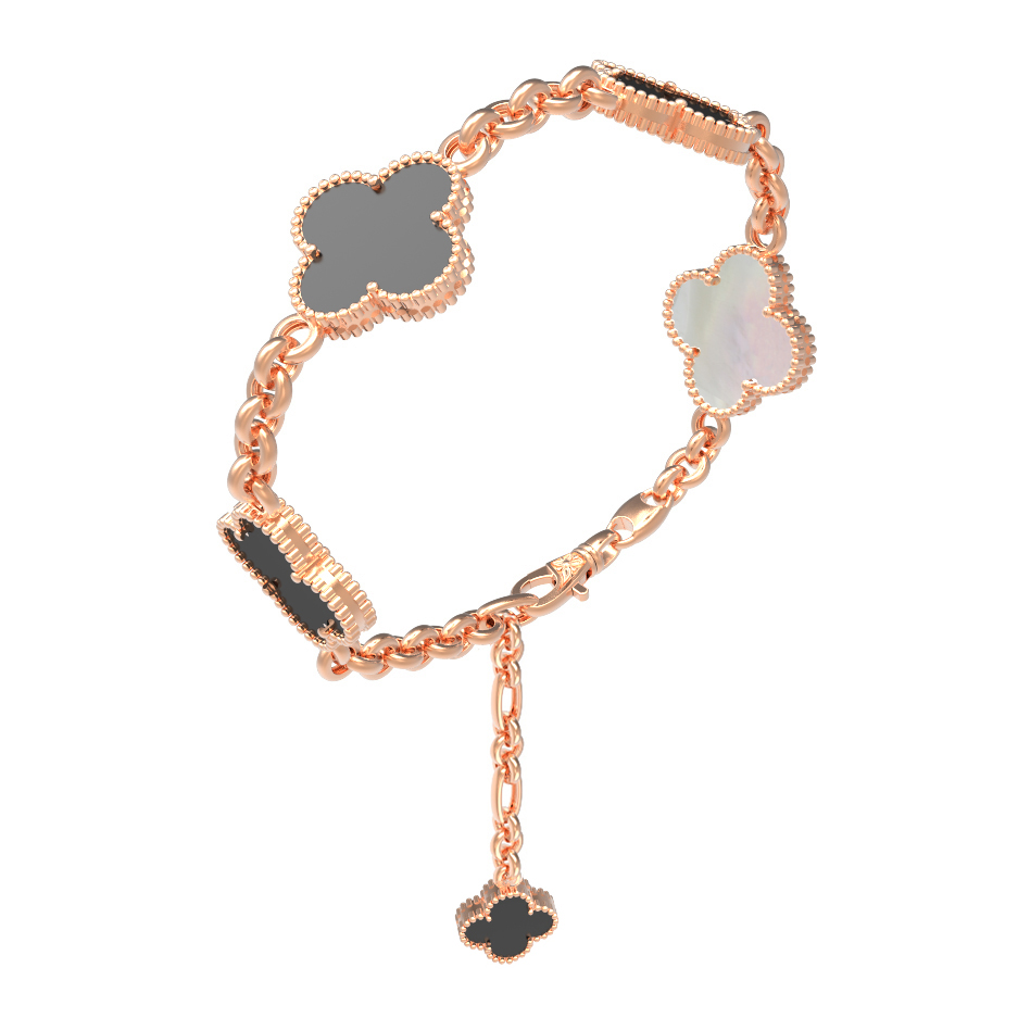 Браслет с клеверами гармонично смотрится как самостоятельное украшение, так и в составе комплектов с другими ювелирными изделиями. Элегантность линий и безупречное сочетание оникса и перламутра делают данный браслет идеальным подарком или инвестицией в личную коллекцию драгоценностей. Подчеркните свою индивидуальность и безупречный вкус вместе с этим изделием из красного золота.