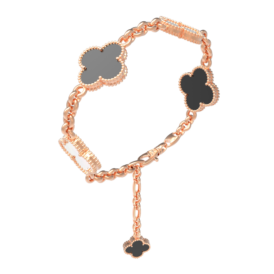 Элегантный и утонченный браслет из красного золота 585 пробы станет безупречным дополнением вашего образа, подчеркивая безупречный вкус и статус. Это ювелирное изделие из коллекции De Luxe — Клевер выполнено в изысканном дизайне Клевер, который давно стал символом удачи и стиля. В центре композиции — три эффектные вставки из оникса и перламутра, гармонично сочетающие глубокий черный цвет и нежное сияние перламутра, создавая благородный контраст с теплым оттенком красного золота.