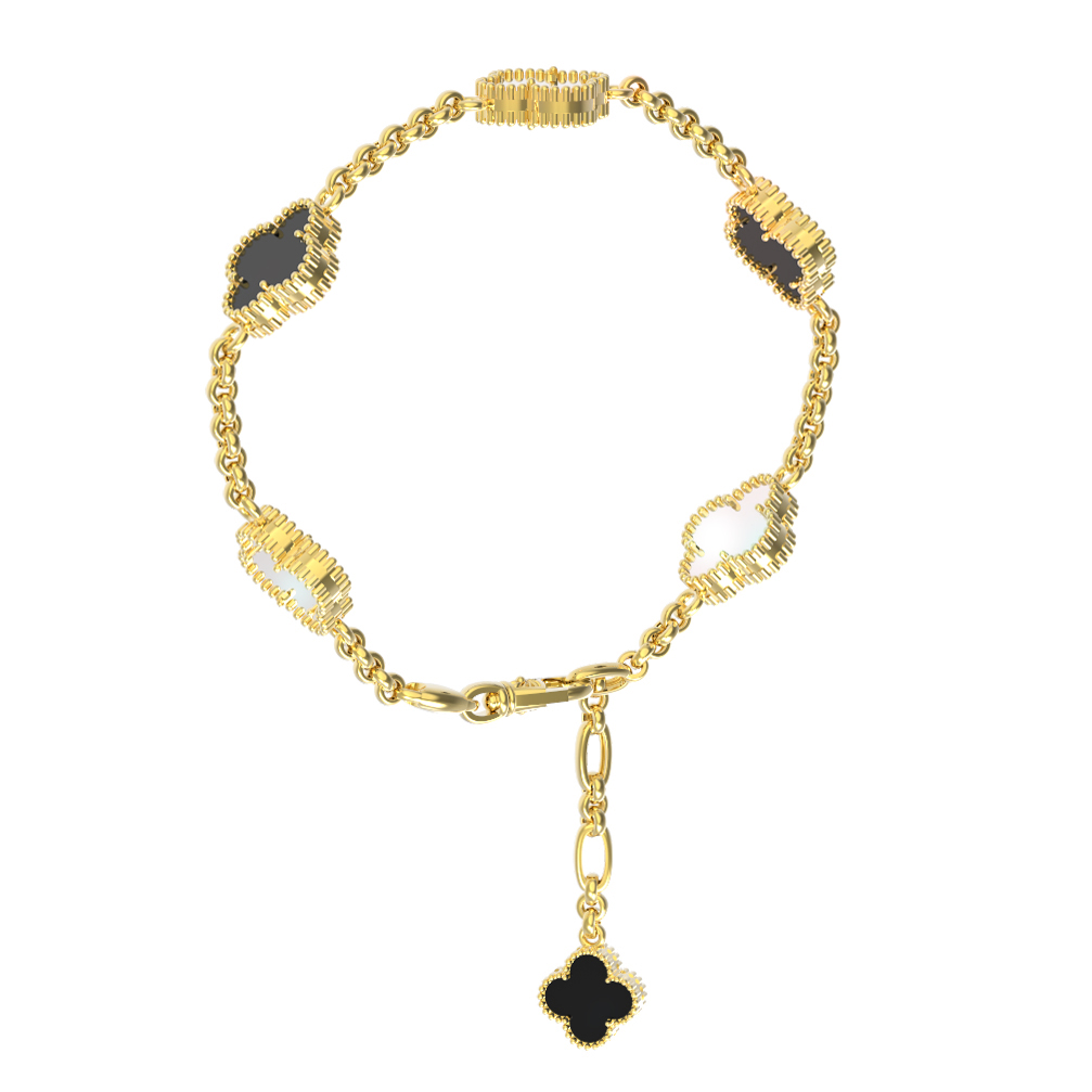 В центре композиции гармонично сочетаются три вставки: глубокий черный оникс и нежный перламутр. Контраст черного цвета вставок и мягкого сияния перламутра придает изделию выразительность и глубину. Браслет отличается универсальностью, он станет прекрасным дополнением как для женщин, так и для мужчин, добавляя любому образу ноту статусности.