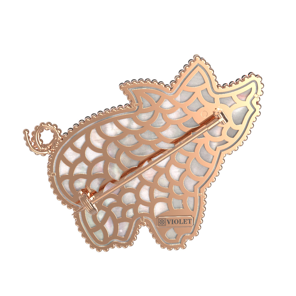 Особую выразительность броши придает сочетание материалов. Основная часть композиции выполнена из натурального перламутра с нежным переливчатым блеском, который гармонично дополняет сияние красного золота. Контуры фигуры деликатно подчеркнуты разноцветной эмалью, что добавляет аксессуару глубины и художественной выразительности. Безупречное сочетание золотого металла и перламутровых вставок делает это украшение по-настоящему уникальным.